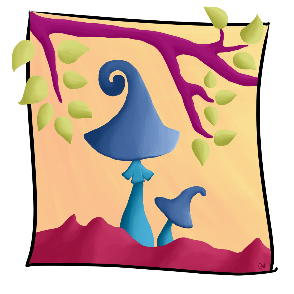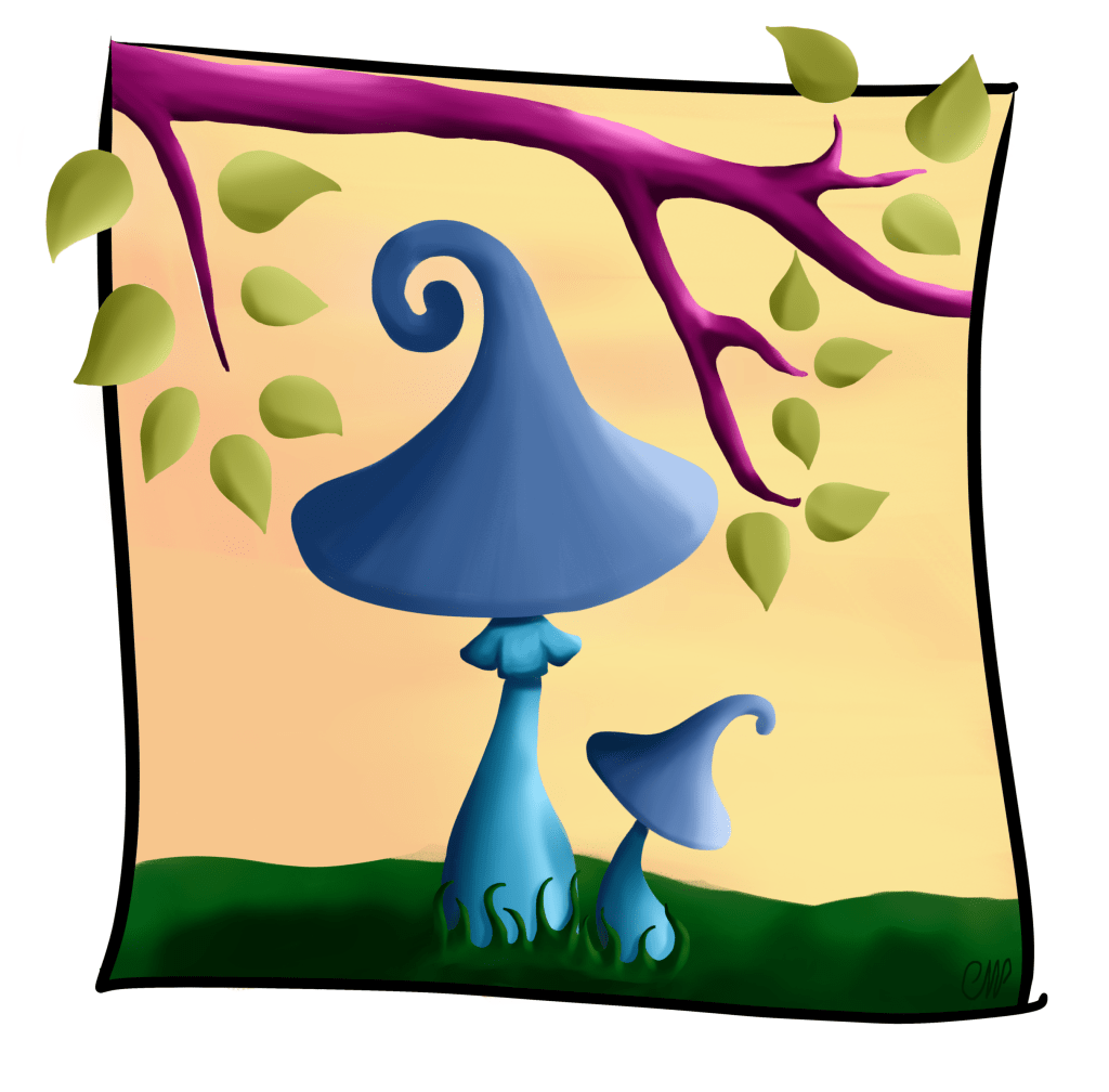 J’ai repris mon dessin au trait, en l’améliorant, pour qu’il soit plus en harmonie avec les autres champis, et j’ai ensuite recoloré le tout, en changeant certaines couleurs et en appliquant certains trucs que j’ai appris entre temps….