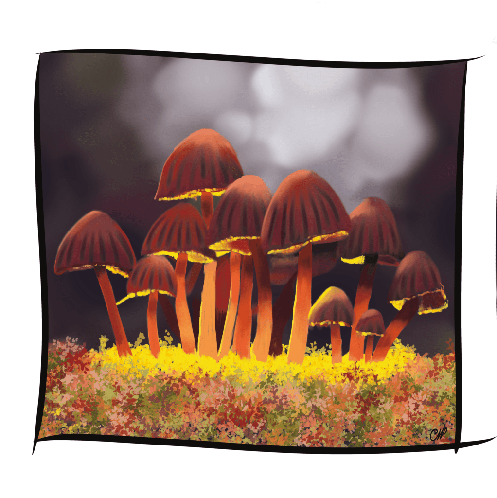 Bon, puisque j’avais un peu (beaucoup) de temps aujourd’hui, je me suis dit que je pouvais me lancer dans de nouveaux trucs…. à partir de photos par exemple, et non pas de dessin au trait…. Sauf que… la photo qui m’a inspirée… ben…. c’était encore une fois une photo de champis….. pffff…. MAIS en plus, dans les couleurs du mois de mon challenge!!!