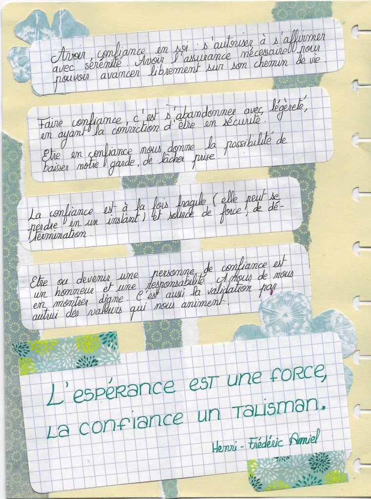 Pour le recto, j’ai gribouillé un motif au stylo gel doré. Je pense que je vais continuer, j’aime vraiment bien l’effet… enfin, jusqu’à ce que je sois lassée hahaha. J’ai choisi un papier orange pour coller l’image de la carte, pour rappeler les rayons du soleil. J’ai gribouillé puis coloré à l’aquarelle une fleur parce que la confiance, même si fragile, on la perd si facilement, elle peut vraiment éclairer notre chemin, et nous inspirer. Et puis j’ai écrit les mot que la confiance m’inspirait. J’ai ajouté des bouts de papier scrapbooking déchirés, dans les tons vert bleuté, pour ne pas être trop dominant mais ajouter un peu d’intérêt. Et j’ai collé le tout ensemble!