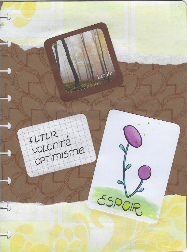 Pour le verso, j’ai repris les mêmes éléments et j’ai ajouté des fleurs en papier (j’en ai refait aujourd’hui, avec des papiers teintés et des chutes de papiers scrap, je me suis bien amusée, c’est chouette de voir ce que chaque découpe peut donner à la fin!). Et puis j’ai écrit mes petites pensées au stylo encre noir. J’ai écrit la citation avec le même stylo gel que pour le recto. Elle me fait sourire, cette citation. Et elle m’a fait comprendre aussi que si j’ai du mal avec la notion d’espoir, c’est aussi parce que je n’ai plus de peur. Le contraste entre les deux n’a donc pas lieu d’être…. de quoi réfléchir ce soir!