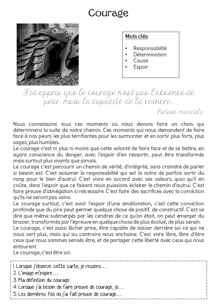 Un petit mot avant de commencer: nous voila rendus au quart de notre voyage. J’avais décidé de procéder de manière alphabétique avec mes cartes… Aujourd’hui, je pense que je vais changer cet ordre… A partir de demain, je tirerai une carte qui constituera mon étape du jour. Plusieurs raisons m’ont fait prendre cette décision: la carte du jour n’entrait pas forcément en résonance avec mon état d’esprit du jour, et l’idée de finir par la tristesse est un peu déprimant hahaha. Pour le reste, les articles seront sous la même forme. La seule différence tiendra dans le fait que les cartes ne seront pas explorées par ordre alphabétique mais ‘par hasard’. Je me sens plus sereine de procéder ainsi. Les 61 cartes seront explorées, et à la fin, vous aurez toutes les étapes, que vous pourrez ordonner par ordre alphabétique ou non, les documents n’étant pas numérotés (je devais quelques part sentir ce revirement de situation, même si mon côté structurant voulait s’exprimer hahaha).