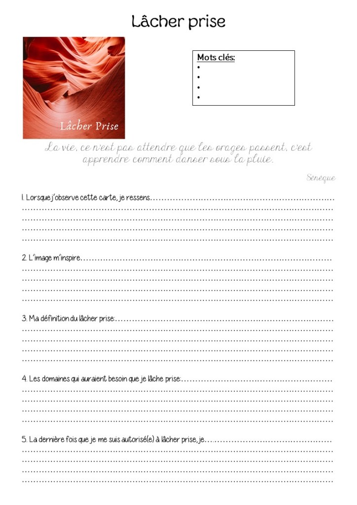 Lorsque j’ai réellement saisie l’idée de lâcher prise et que je me suis libérée de fait des contraintes que je m’imposaient ou qui m’étaient imposées, ma vie a été transformée, effectivement. Je vis désormais en accord avec moi-même, je ne me justifie plus pour chacun de mes choix, de mes réactions, de mes envies. Je suis attentive à ce qui se passe autour de moi et j’effectue mes choix en fonction de ce qui me fait vibrer. Je ne passe plus mon temps à élaborer de multiples plans, principaux et annexes, en essayant de couvrir l’éventail de possibilités. Je saisis ce qui se propose à moi, et je ne me pose pas de questions inutiles. Si je l’ai saisi, c’est que c’était quelque chose que j’avais besoin de vivre, de connaitre, d’expérimenter. Lorsque le temps sera venu de vivre autre chose, elle se présentera à moi. Je peux donc faire ce que j’ai à faire, vivre ce que j’ai à vivre sans me préoccuper du reste. J’ai lâché prise.