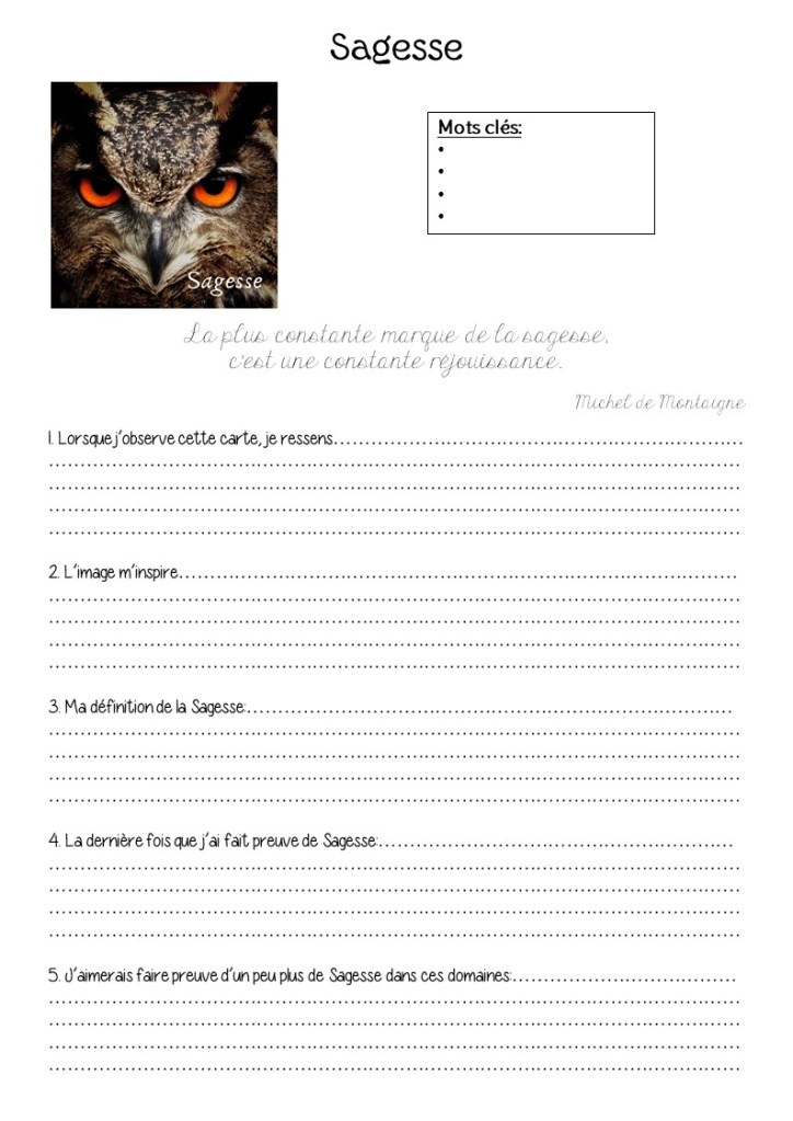 On continue avec mes cartes animalières! J’ai choisi la chouette pour illustrer la sagesse par référence mythologique mais aussi parce que son regard me parait parfaitement représenter ce qu’est la sagesse pour moi: un mélange subtile de connaissance de soi, de clairvoyance et d’expérience.