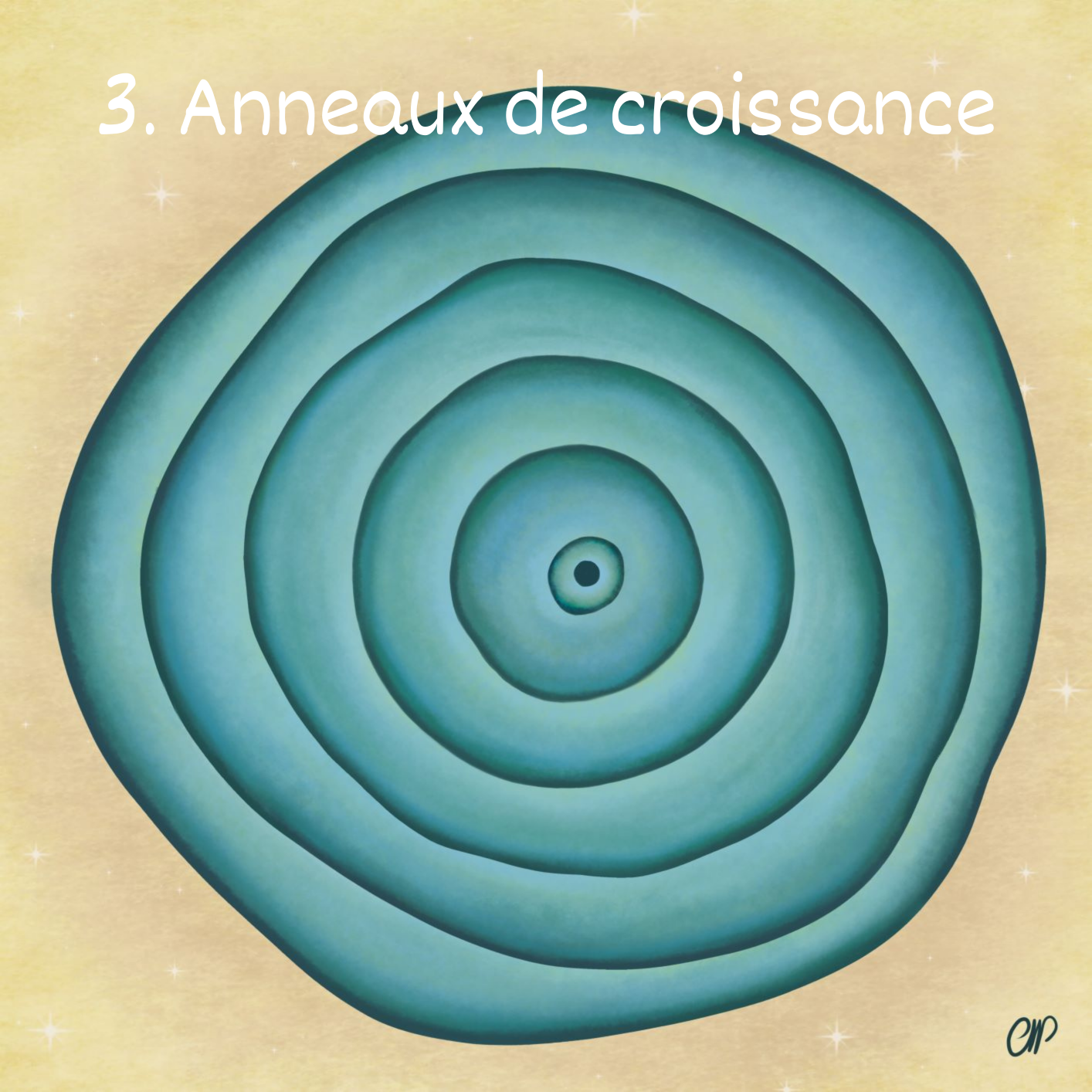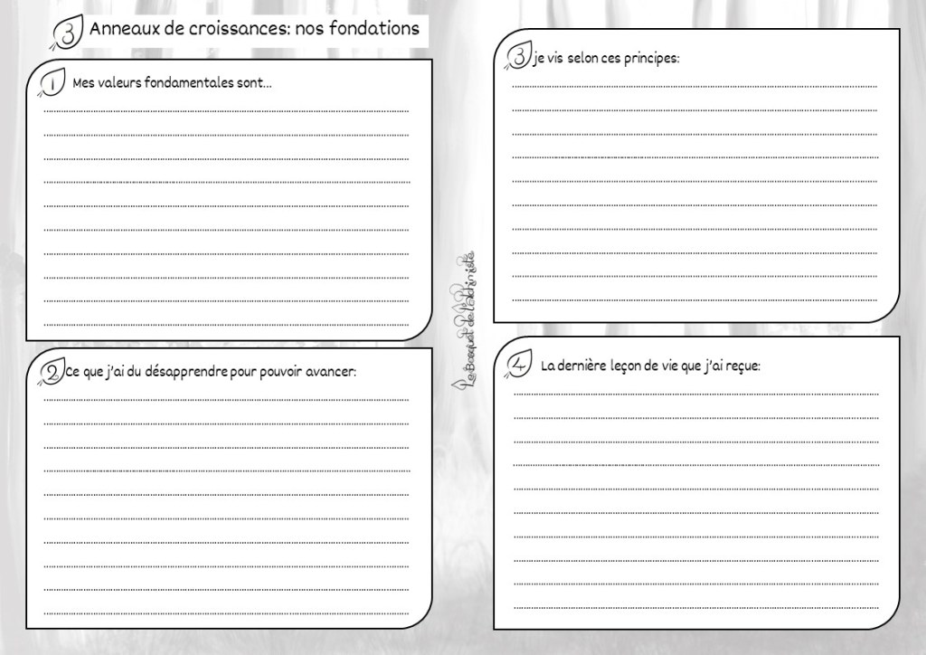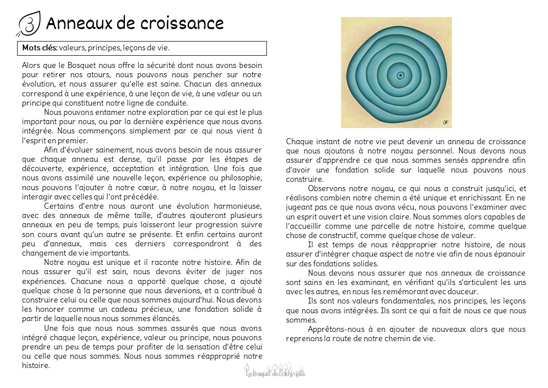 Alors que nos racines plongent dans les profondeurs du sol du Bosquet, nous pouvons nous concentrer sur notre coeur, notre noyau. Nous pouvons retirer nos atours et examiner en profondeur nos anneaux de croissance. Chaque anneau raconte une histoire sur une leçon apprise, les valeurs qui sont importantes à nos yeux, les principes selon lesquels nous menons notre vie. Chacun d’entre eux témoignent de notre évolution en tant qu’être humain, et constitue la base d’une nouvelle croissance, une nouvelle évolution de notre être.