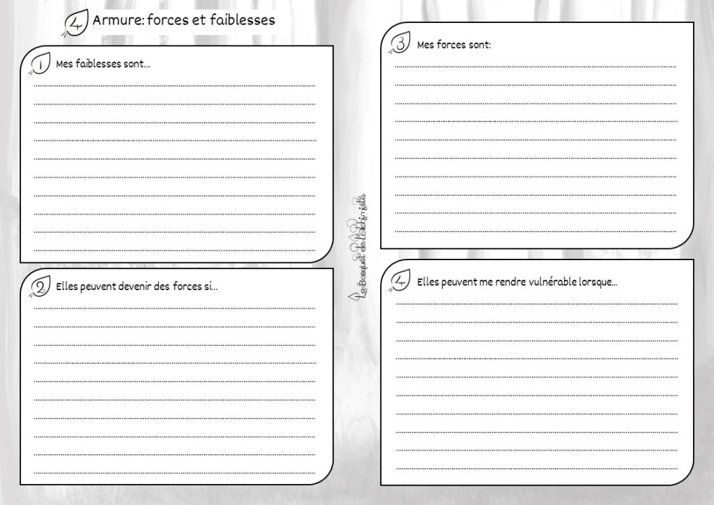 Afin de nous protéger, afin qu’elle soit plus confortable, notre armure doit être équilibrée, et pour y parvenir, nous devons faire le point sur nos faiblesses et nos forces, nous assurer qu’elles correspondent à ce qu’on peut attendre d’elles. Nous devons les accepter comme les parties du tout que nous sommes. Si nous avons besoin de faire des modifications, c’est le bon moment. en les observons honnêtement, sans jugement, en les acceptant, et en les accueillant.
