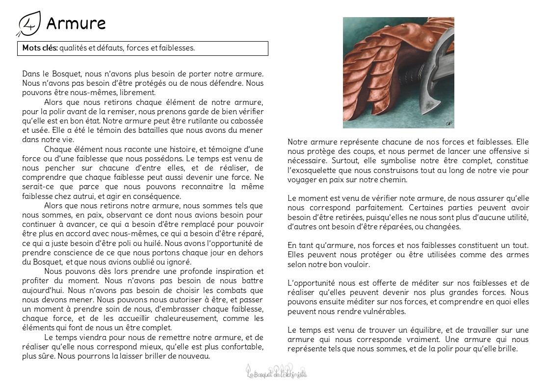 Alors que nous retirons notre armure dans le Bosquet, prenons le temps d’observer nos forces également. Elles sont ce qui nous font aller un peu plus loin, peut importe ce qui se dresse devant nous, ce sur quoi nous pouvons compter pour nous aider à faire face, à évoluer, à nous épanouir. Il est inutile de faire preuve d’humilité ici et de nous cacher derrière elle. Parce que nos forces peuvent aussi devenir nos plus grandes faiblesses si nous ne les utilisons pas de manière adéquate.