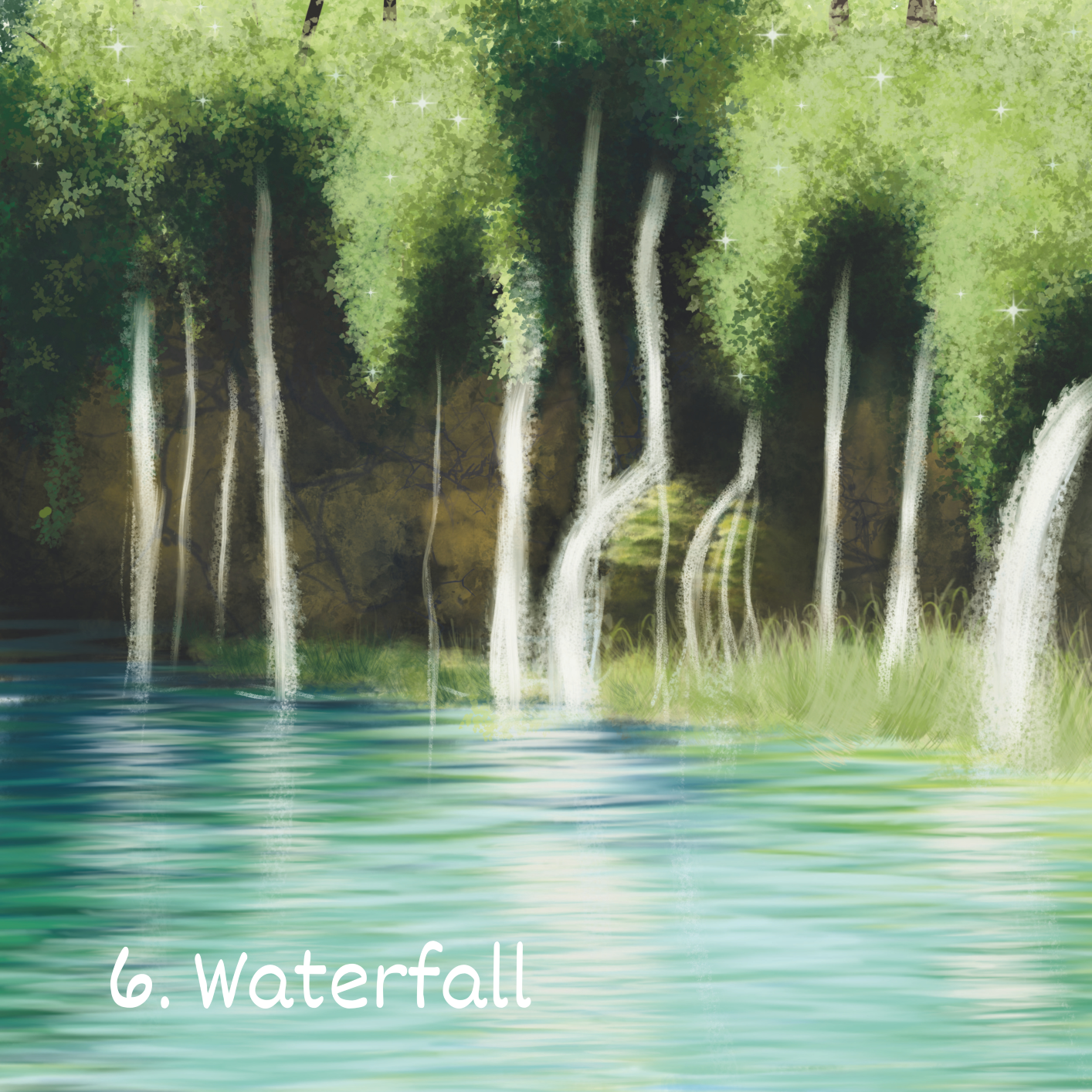 I wanted to draw something peaceful but joyful, a bit mysterious and mystic, with a cooling effect, and places I could easily visualize myself resting. The water had to be as pure as possible, the waterfall coming from the grove, the foliage would offer shadow to protect us from direct sun, the cliff had to have some mysterious patterns that would allow the mind wandering… and the soft grass would offer us a cozy bed to lay onto. I can picture myself sitting on the rocks under the waterfall and letting the water washing me from all that bothers me… I hope it gives you the same feeling.