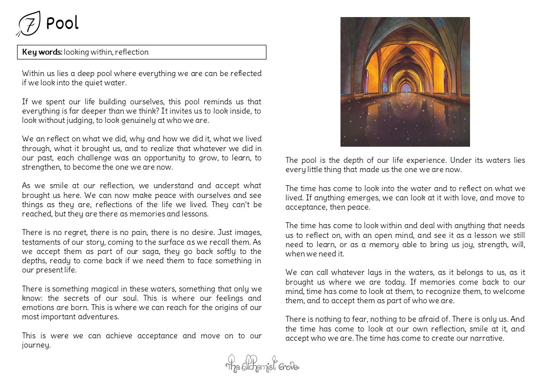 When I think about self reflection, I visualize a pool filled with deep water. This time, I went far outside my comfort zone, and I ended up tracing it, after 2 days of dead ends. I had this in my mind, I couldn’t draw anything else, this is what I needed… I learned a lot into the process, and I guess I really didn’t go for the easiest path, but it was such a good experience to live, I don’t regret it. So this pol it was. When I think about self reflection, I also imagine my memories as pictures lying at the bottom of the pool, emerging now and then, when I call them. I also imagine myself looking into the water, seeing my own reflection and learning from it. It’s a very intimate time, and I wanted to express the secret and sacred time it can be if we allow it to be. And in the grove, everything is about our personal magic, so I had to let it show. There is something magical in the fact to be able to reach something that no longer exist if not within ourselves. Our memories, the lessons they taught us, the path they had made us take. The wisdom they hold. If this is not magic, I don’t know what is. We can draw into them each time we desire and they sometimes surface to warn us, or to comfort us. This, my friends, is magic.