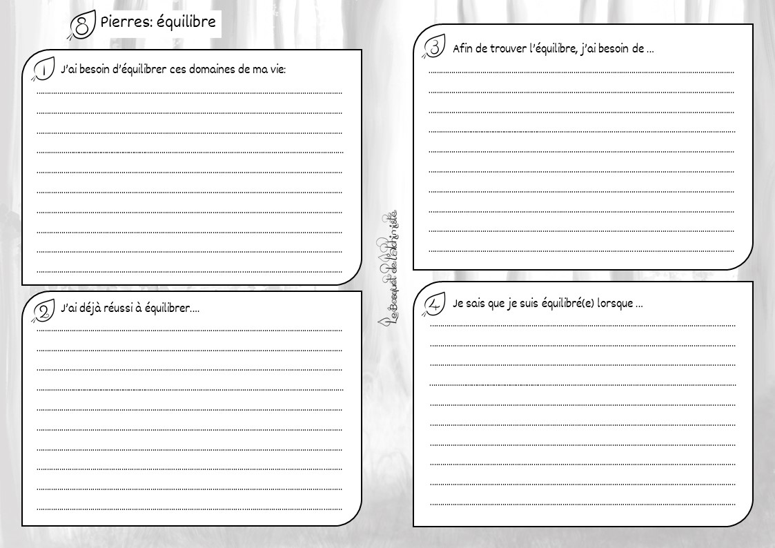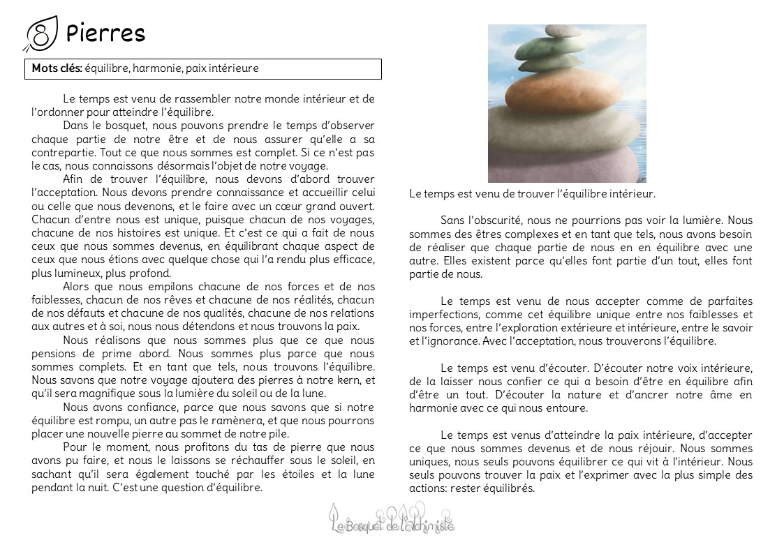 Trouver un équilibre requiert de nombreux ajustements, et notre pile de pierres peut s’effondrer quelques fois avant que nous trouvions le moyen de les organiser. Cela demande de la patience, et de la détermination. Mais une fois que nous réussissons à trouver l’équilibre entre ce qui fait de notre vie ce qu’elle est, nous trouvons également la paix. Et tout ce temps passé à mettre en ordre cet amas des pierres colorées et de toutes formes de nos centres d’intérêt et de nos responsabilités, de nos passions et de nos obligations, de nos moments de solitude et de sociabilisation, était également une manière pour nous de nous connaitre, de comprendre ce qui est important à nos yeux.