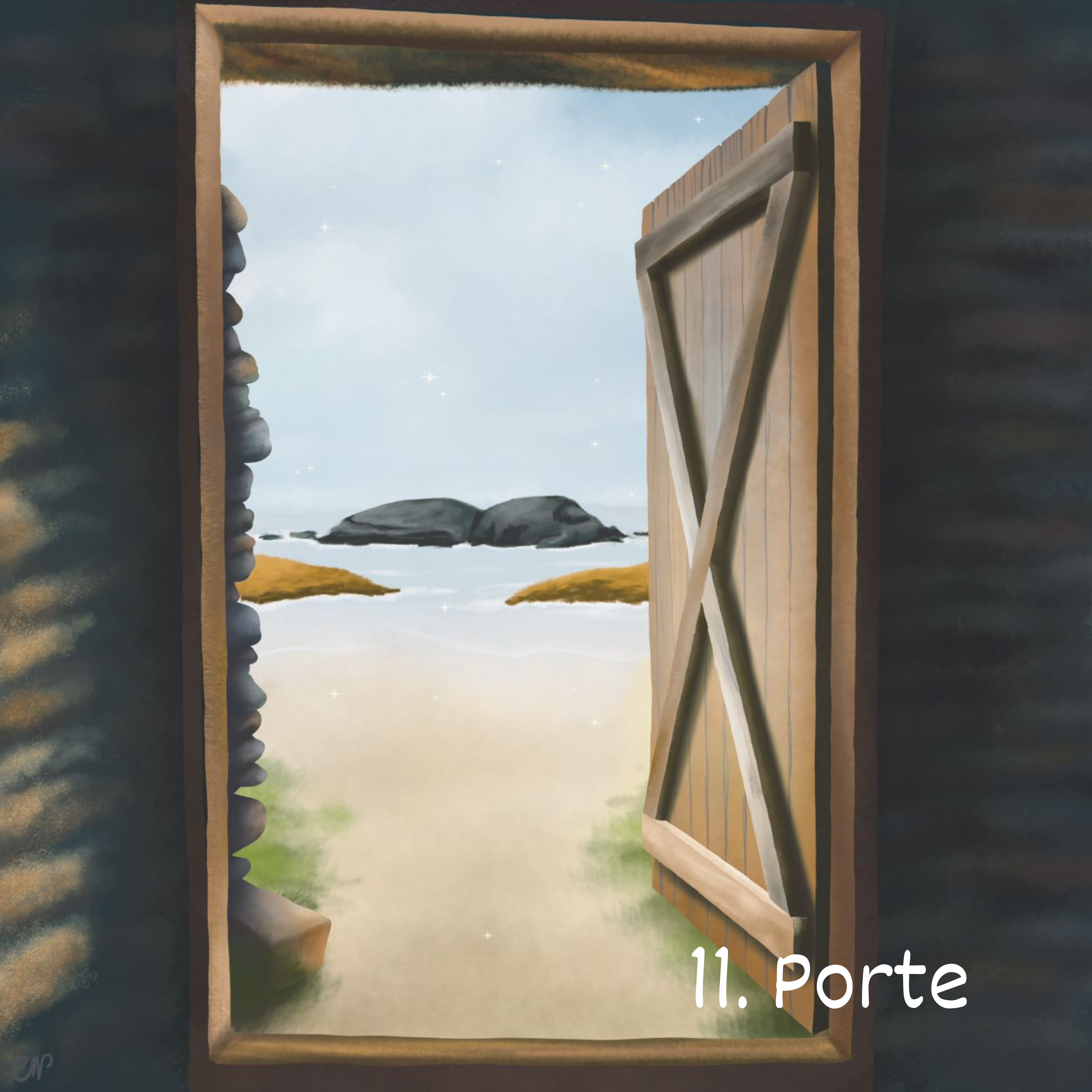 Je voulais exprimer l’ouverture à ce qui vient, et j’ai opté pour la porte, puisqu’elle permet que nous l’enjambions pour sortir de notre zone de confort. C’est un rite de passage, lorsque nous décidons d’agir et d’avancer réellement. Je voulais montrer un contraste entre le connu et ce qui nous attend. Et pour nous motiver, l’extérieur devait être lumineux. Sinon nous pourrions préférer rester à l’intérieur et nous n’irions pas explorer le monde avec confiance. J’ai donc dessiné des murs très sombres, mais qui sont éclairés par le moindre rayon de soleil. Nous ne sommes pas dans l’obscurité, nous avons juste éteint les lumières avant de sortir. La porte n’a pas de poignée, parce que nous sommes libre d’aller et venir comme nous le désirons. Nous n’avons pas besoin de nous enfermer à l’intérieur, nous sommes en sécurité, nous pouvons partir sans craindre pour ce que nous avons laissé derrière nous, tout est protégé. Je voulais montrer que le monde nous accueillait, j’ai donc dessiné une plage paisible, avec du sable fin, et de l’herbe ici et là, pour symboliser la vie qui nous attend. Je voulais exprimer la protection, alors j’ai ajouté des îles qui protègent notre refuge de potentielles vagues destructrices. Rien n’est parfait, et les nuages sont là pour nous rappeler que nous pouvons rencontrer des orages sur notre route, mais pour le moment, tout va bien, tout est paisible, tout est en place pour nous aider à avancer. Et puisque nous sommes ce que nous sommes, j’ai ajouté quelques étincelles de ci de là!