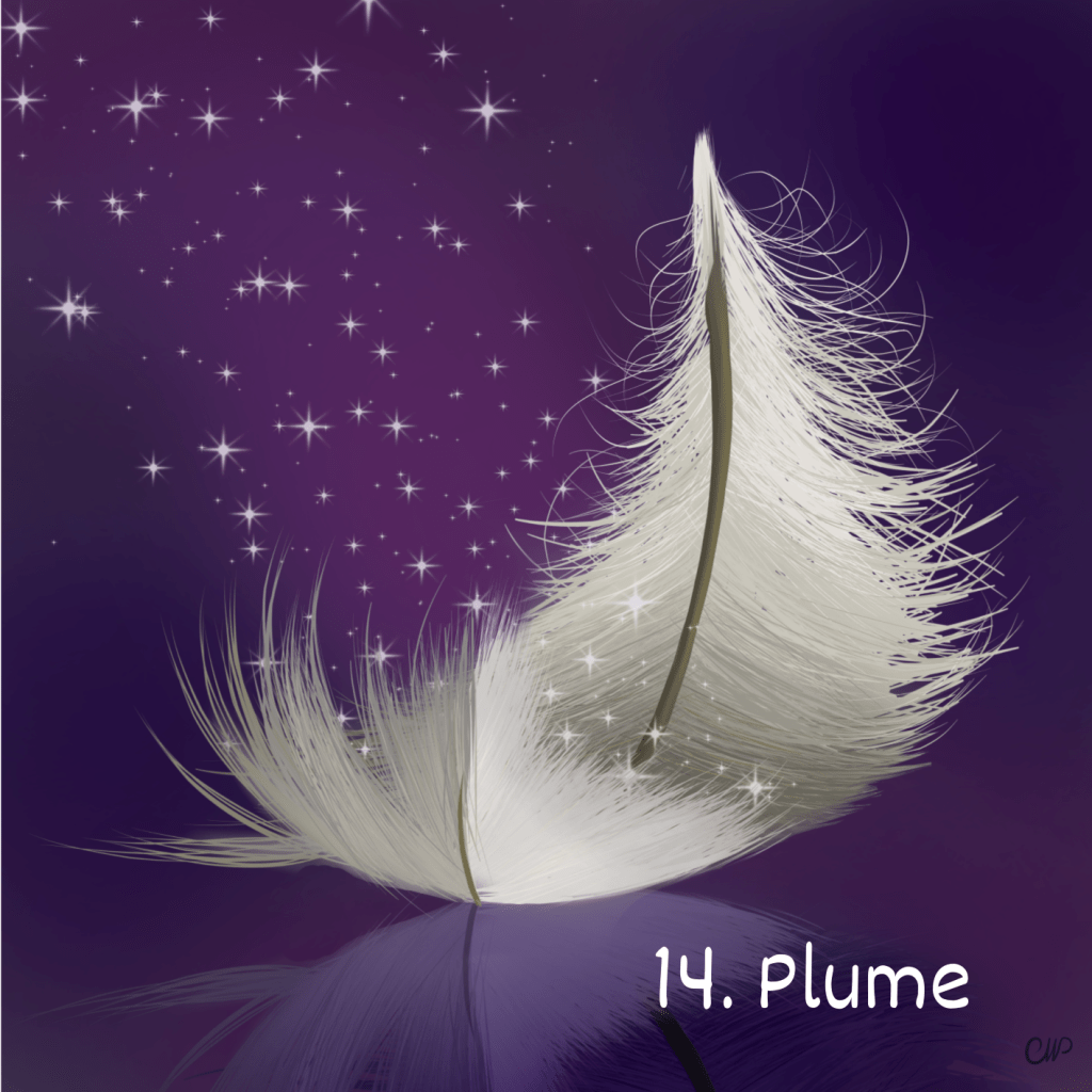 je voulais dessiner quelque chose qui exprimait un toucher délicat. J’ai d’abord pensé à une feuille qui effleurait de l’eau, mais j’avais déjà dessiné une feuille sur ma dernière carte, et je voulais quelque chose de différent. Et l’idée de la plume est venue naturellement. Je n’avais dessiné de plume pseudo réaliste avant, si ce n’est une approche avec un oiseau. J’ai adoré la dessiner! je pense que j’en ferai d’autres que je partagerai, de ci, de là. j’ai choisi de la faire la plus simple possible, et de la garder dans des tons neutres et clairs. Parce que je savais que le fond serait dans les tons aubergine et violet, puis qu’elles étaient parmi les couleurs favorites d’Emma, et que je voulais l’honorer à ce moment particulier de l’année. J’ai beaucoup expérimenté avec cette carte, j’ai repoussé mes limites, j’ai joué avec les calques et les reliefs, les reflets etc… et j’espère que vous l’aimerez autant que moi! Et puis, j’ai ajouté les petites étincelles magiques, parce que vraiment, le toucher, est un sens magique.