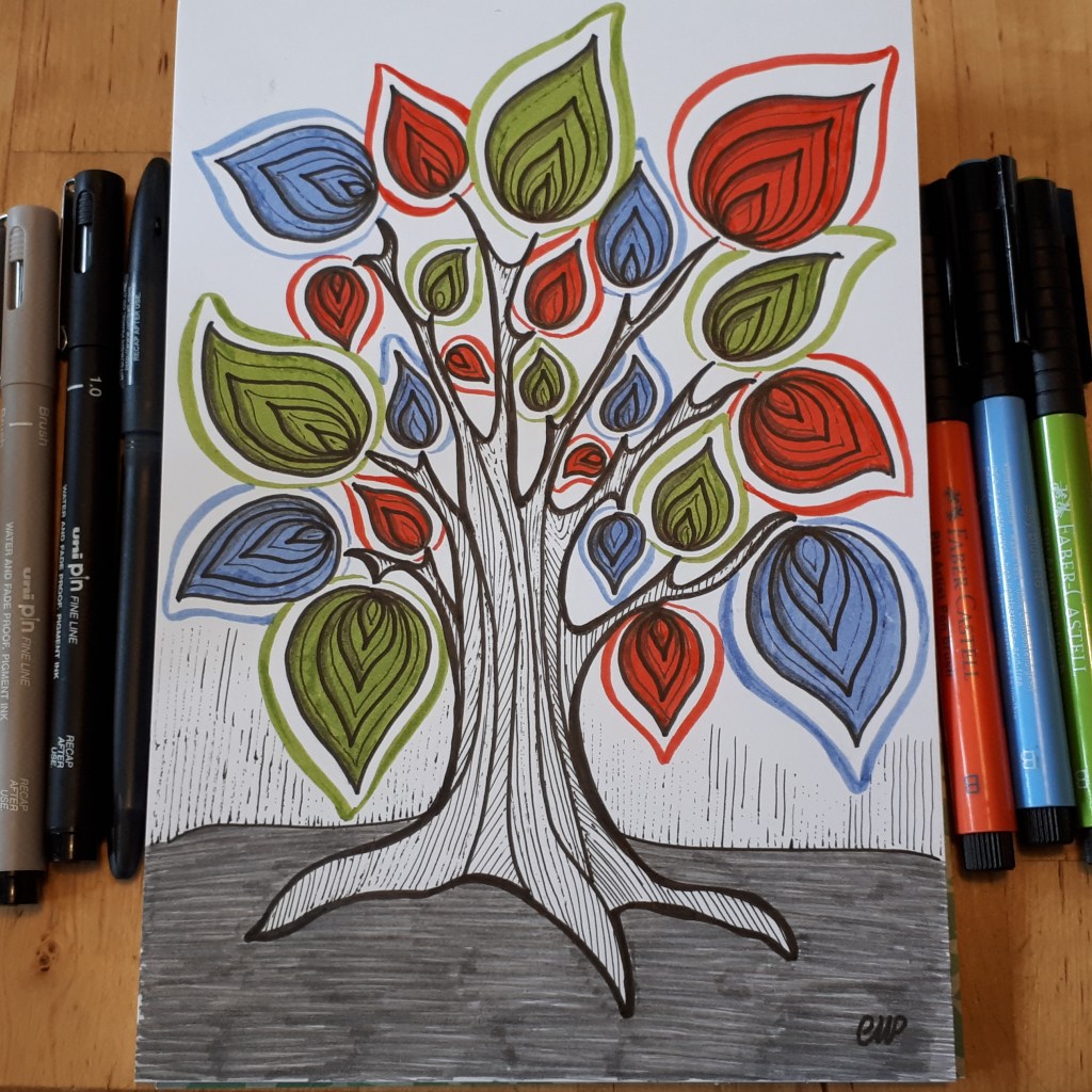 Le stylo gel, comme beaucoup de stylo gels, n’avait pas un flux d’encre régulier.. mais du coup, j’en ai profité pour apporter un peu de texture… pour le reste, les feutres pinceaux étaient vraiment sympas à utiliser, et j’ai découvert mes feutres techniques préférés en version feutre pinceau avec encre grise… chouette!