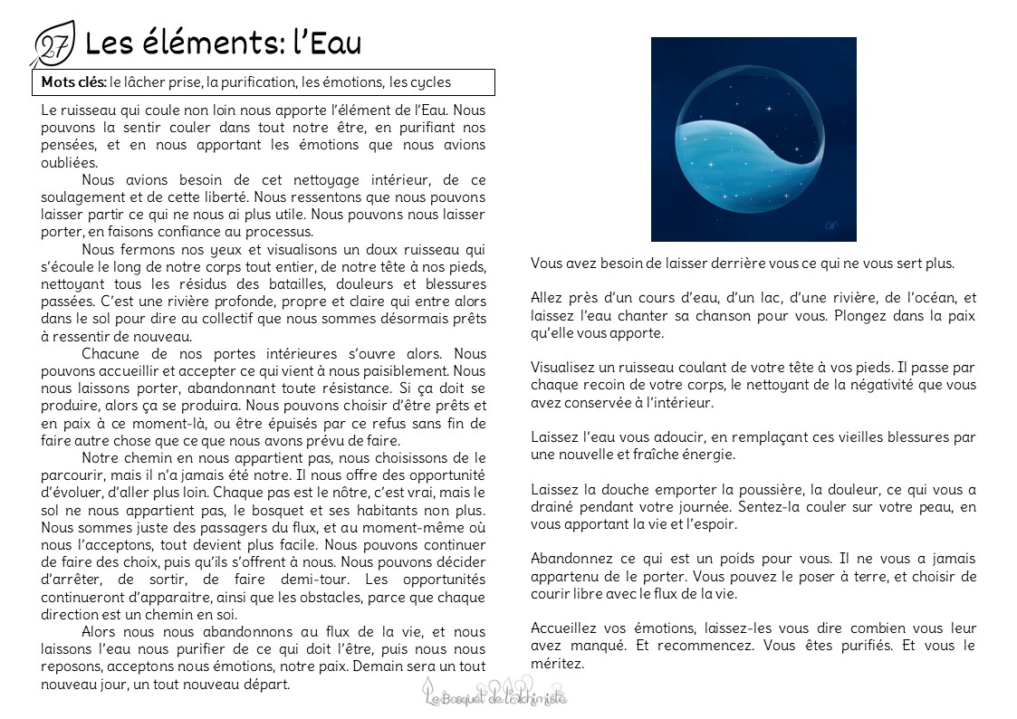 - Arrive le moment de clore ma médiation. Je visualise une dernière fois l’eau courant dans tout mon corps, et je la laisse s’échapper par mes doigts et mes pieds, la laissant rejoindre l’eau de la douche courant sur ma peau. Je suis désormais purifiée de l’intérieur et de l’extérieur.