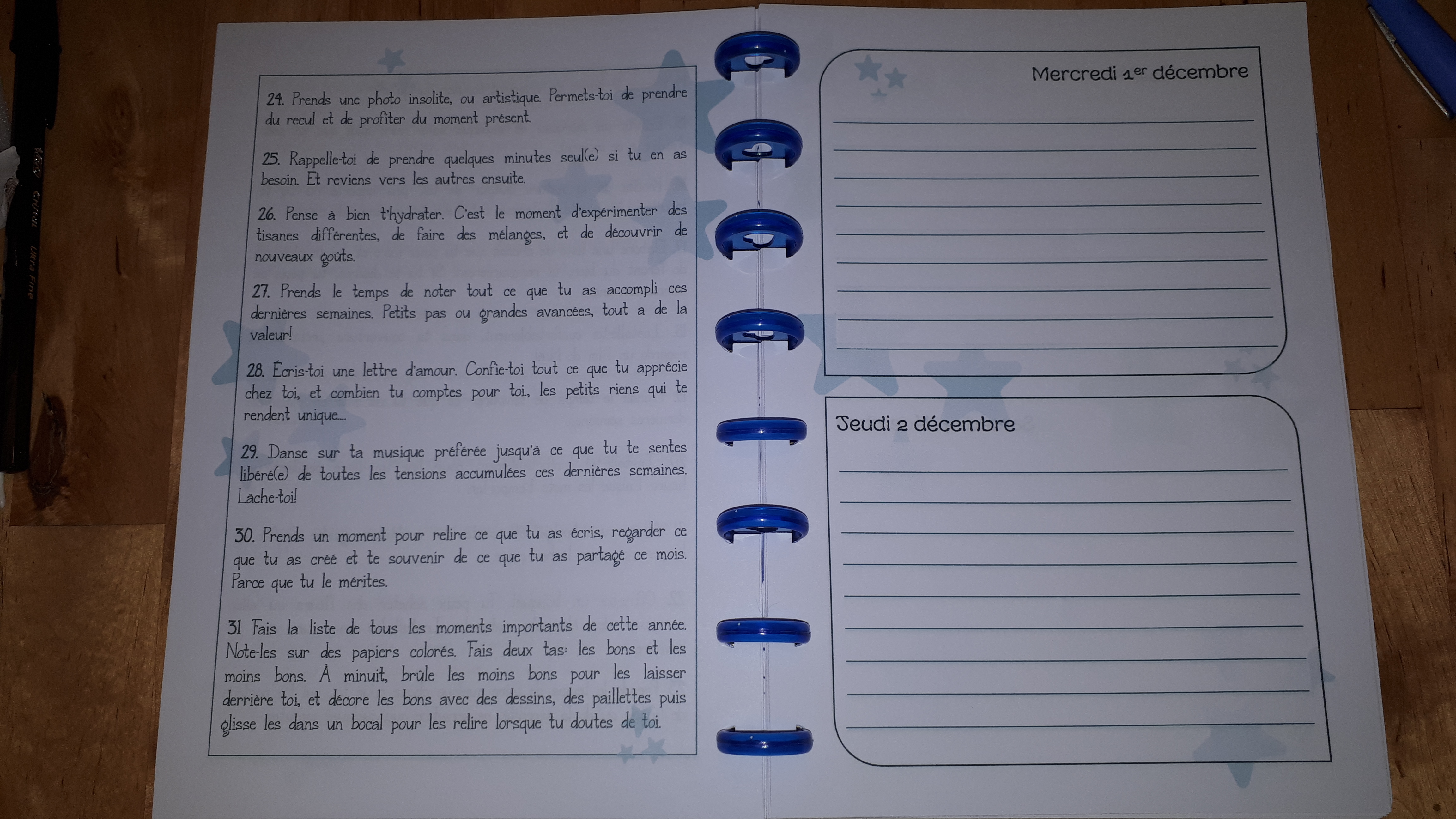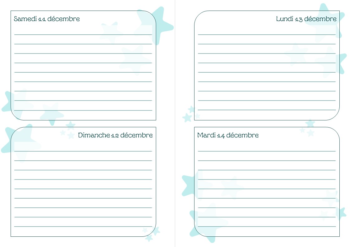 Le fichier comprend 2 pages. Il vous suffit de les imprimer en recto verso, en sélectionnant « retourner sur les bords courts ». Vous pouvez ensuite les utiliser comme telles, ou les découper sur la ligne médiane et perforer les deux pages obtenue pour les glisser dans votre planner. C’est ce que j’ai fait !