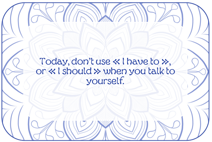 We are oftentimes far too rough with ourselves, judgmental, and we accept from ourselves far more than we would from others. Today, we will focus on our thoughts, and work on rewire all those « I should », « I have to » that are bugging us. Is it really useful? Is it really mandatory? What if I took another path? What if I refused to do it? Is it something I put on myself, or does it come from others? Is it about my own expectations or about what others expect from me? Let’s use our discernment and stop abusing ourselves.