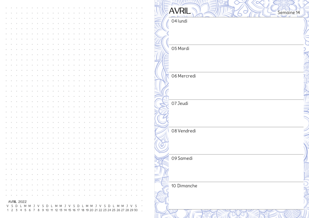 Les pages hebdomadaires (j’ai repris les derniers jours de mars, ça me paraissait plus pertinent pour ceux qui n’auraient pas les pages de mars):