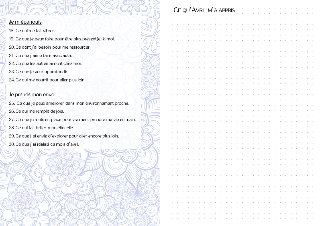 Dans le document pdf, vous trouverez 30 cartes A6 à imprimer. Le png ci-dessus est de bien moindre qualité que le pdf. Ce mois-ci le thème du voyage est l’épanouissement. Les cartes sont faites pour être imprimées en recto verso, l’image au recto correspondant à la question du jour (les questions sont numérotées) au dos. Mais vous pouvez n’imprimer que les images si vous le désirez.