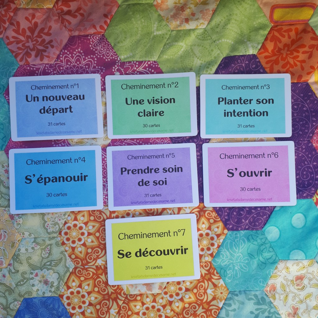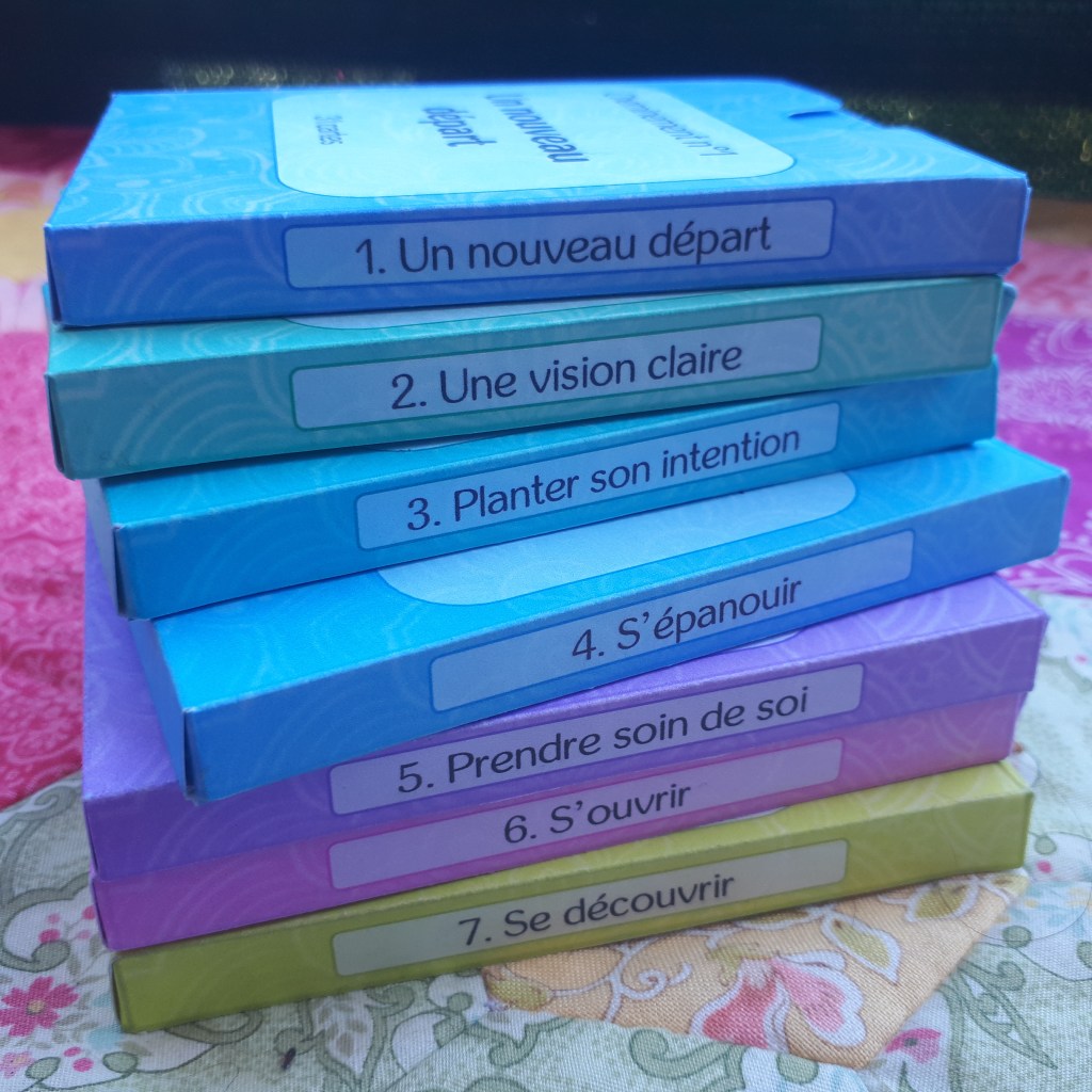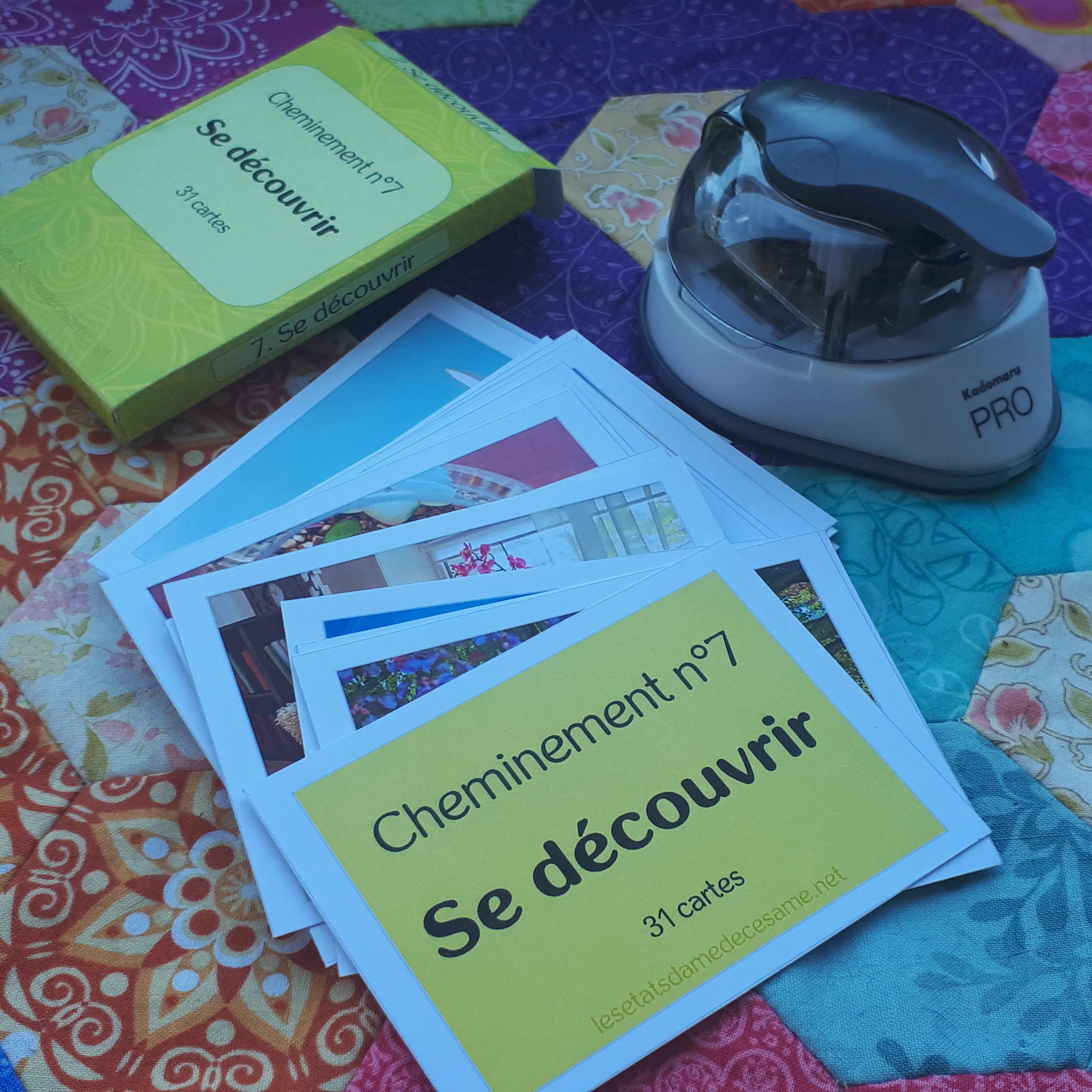 Canicule? Pas de souci, je reste au ‘frais’ chez moi, et je prends le temps de refaire TOUS mes jeux de cartes du cheminement en version cartes à jouer ( 7cm x10 cm). J’avoue, j’aime vraiment ce nouveau format!! Et ils sont tellement chouettes dans leurs petites boites assorties!