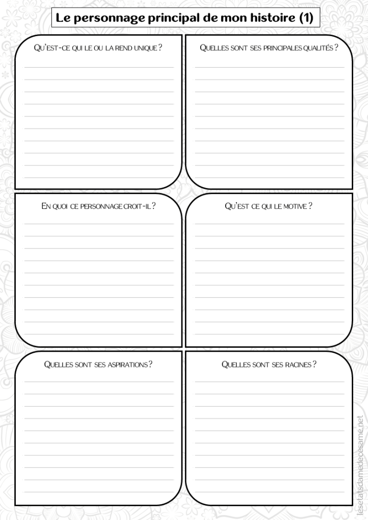Lorsque ça m’arrive, je me décentre, et j’essaie de me voir comme un artiste verrait son personnage principal. Parce que je suis le personnage principal de ma propre histoire, par définition. Pour vous aider à le faire, je vous ai préparé un petit document. Plus tard, nous affinerons cette description, mais aujourd’hui, nous restons simple. Et le fait de répondre comme on le ferait en parlant d’un personnage nous aide à ne pas être dans le jugement, mais dans la description. Quelles sont ses principales qualités ? Qu’est-ce qui le ou la rend unique ? Qu’est ce qui le ou la motive ? En quoi ce personnage croit-il ? Quelles sont ses racines ? Quelles sont ses aspirations ? Un pas à la fois, un jour à la fois.