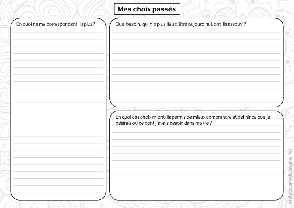 Ce n’est pas si facile de voir les choix que nous pouvons regretter ou qui n’ont pas de sens aujourd’hui sous un jour positif. Et pourtant, si on réfléchit bien, ils nous ont apporté quelque chose, et ils avaient du sens à un moment de notre vie. Pour vous aider à faire le point, j’ai créé ce document.