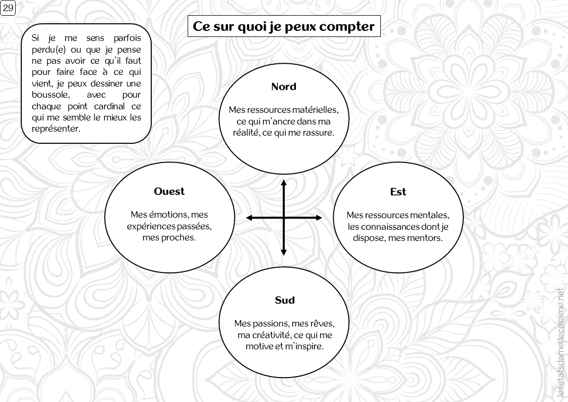 Si je me sens parfois perdu(e) ou que je pense ne pas avoir ce qu’il faut pour faire face à ce qui vient, je peux dessiner une boussole, avec pour chaque point cardinal ce qui me semble le mieux les représenter.