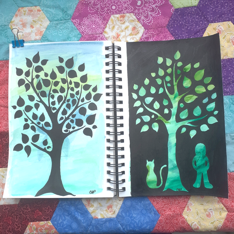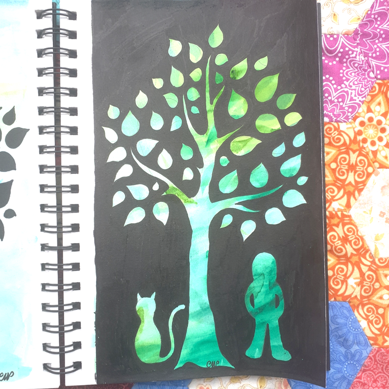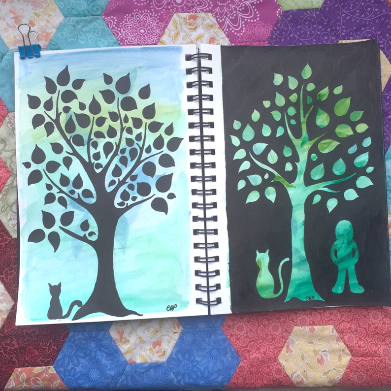 et puis en face, je me suis dit que je pourrais faire le négatif, en laissant la couleur s’exprimer dans l’arbre, sur un fond noir… mais ça faisait un peu trop. Alors j’ai dessiné un chat, parce que Mini-poilue me regardait et que ça m’a fait sourire… et puis j’ai dessiné une autre silhouette, celle de celle qui aimait tellement les chats et la nature… et me voila toute émue devant le résultat… La poilue et la gaufrette, qui tiennent compagnie à cet arbre, qui partagent ses couleurs, même dans l’obscurité…