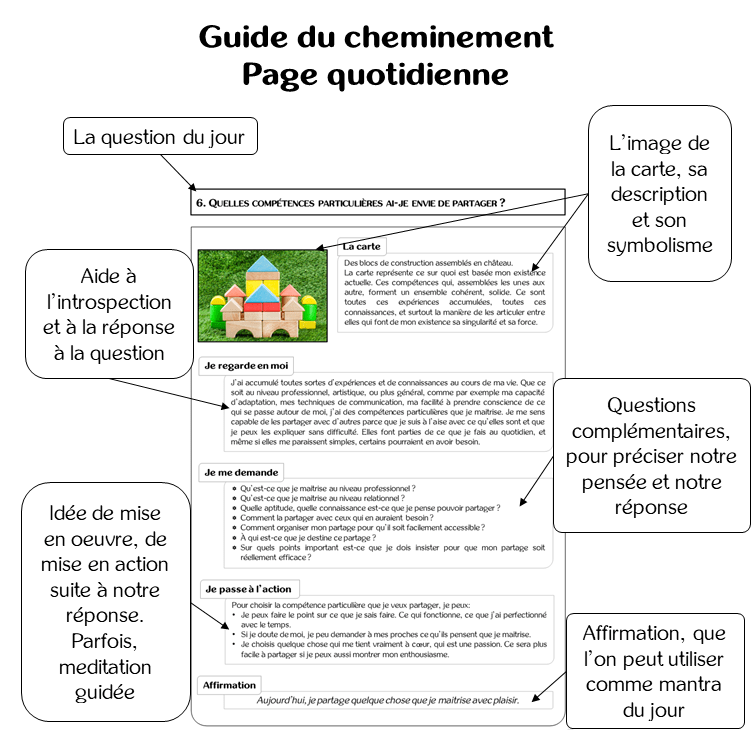 Les cartes et le guide complet (l’article du blog n’en est qu’un extrait) sont disponibles sur cette page. Je les ai créés spécifiquement pour ce cheminement, en essayant de vous proposer plusieurs modalités pour que vous puissiez cheminer à votre guise. Les cartes ont une image inspirante au recto et une question au verso. Dans le guide, chaque jour a une page dédiée, avec des rubriques qui vous inspireront, vous guideront, vous accompagneront.