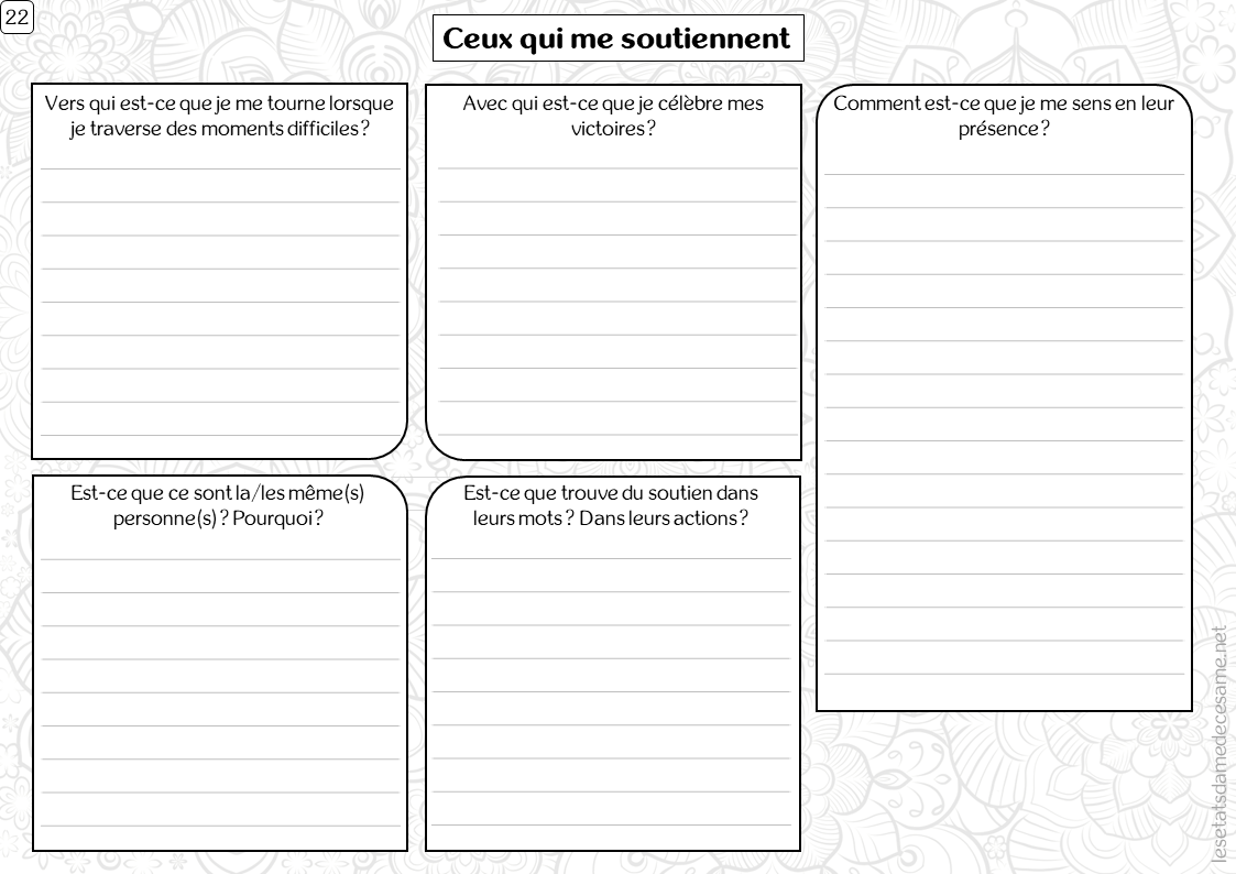 Il est temps de prendre soin de mon réseau de soutien!! Qu’il soit constitué d’une seule personne ou de toute une tribu, il est temps de reconnaitre leur présence dans ma vie. Je peux: