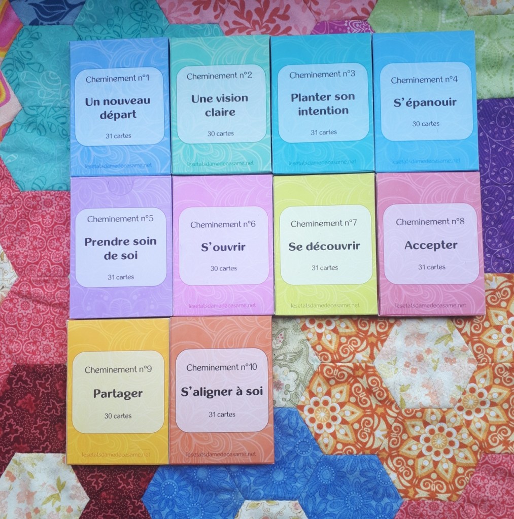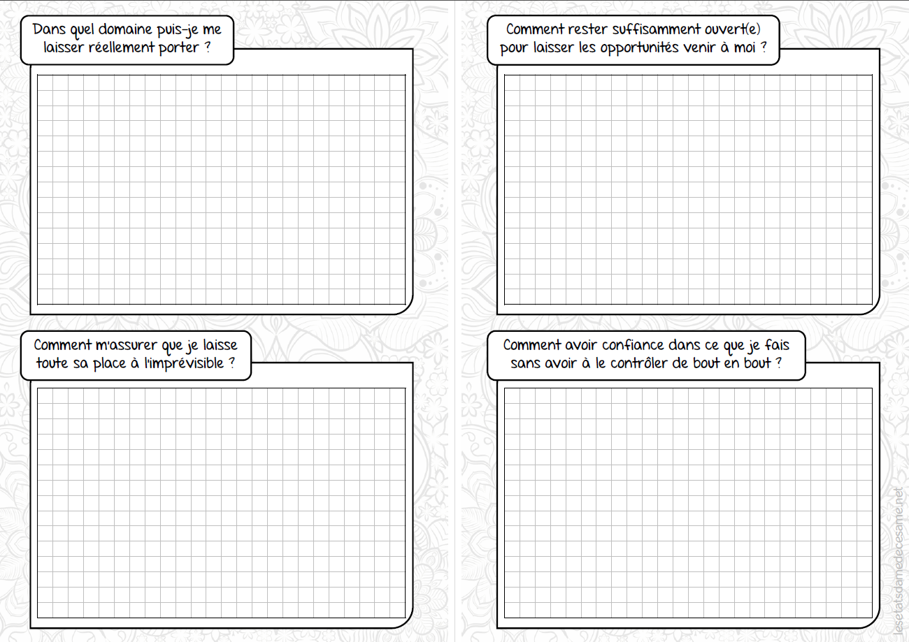 Ce cheminement, comme les précédents, est constitué d’une carte par jour, et d’un guide, que vous pouvez trouver ici. Chaque jour, je vous partage des extraits du guide, sous la forme de pistes d’actions, et d’une fiche avec des questions pour vous permettre de cheminer (je suis plutôt contente du nouveau format des fiches, j’espère qu’il vous plaira également!). À la fin du cheminement, les fiches seront transférées dans deux documents pdf que vous retrouverez sur la même page que les cartes et le guide.
