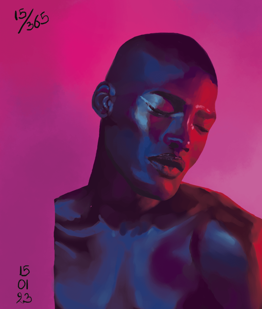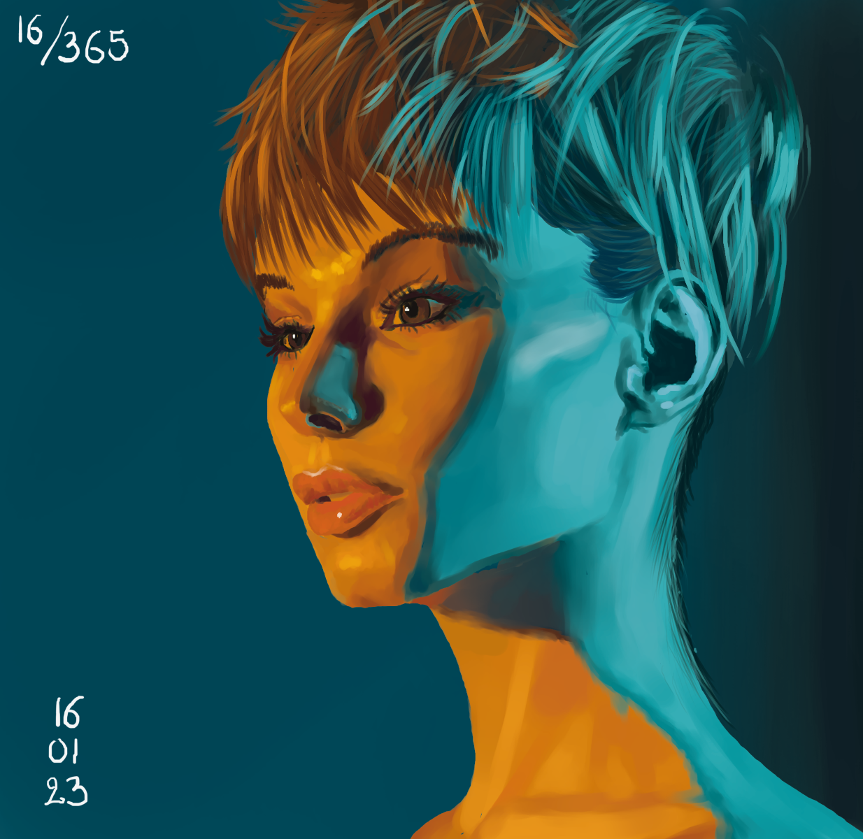 Premier portrait de la semaine, ça commençait fort!! Mais je me suis régalée à le faire, à jouer avec ces couleurs (qui étrangement, du coup, étaient plutôt justes hahaha). Vraiment sympa, et je m’en servirai comme étude à présenter pour mes cours (3 études à faire, avec comme thème principal la lumière).