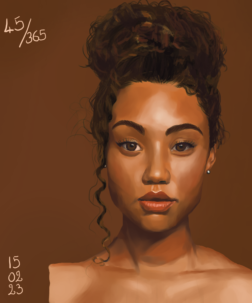 Je suis définitivement plus à l’aise avec les peaux mates. Cette fois, j’ai eu du mal avec les cheveux, même si je suis plutôt fière de la mèche du côté. Et je pense avoir bien capté et rendue son expression, ça commence vraiment à venir!! Ce portrait était quand même presque monochrome, c’était surprenant, mais je me suis régalée!