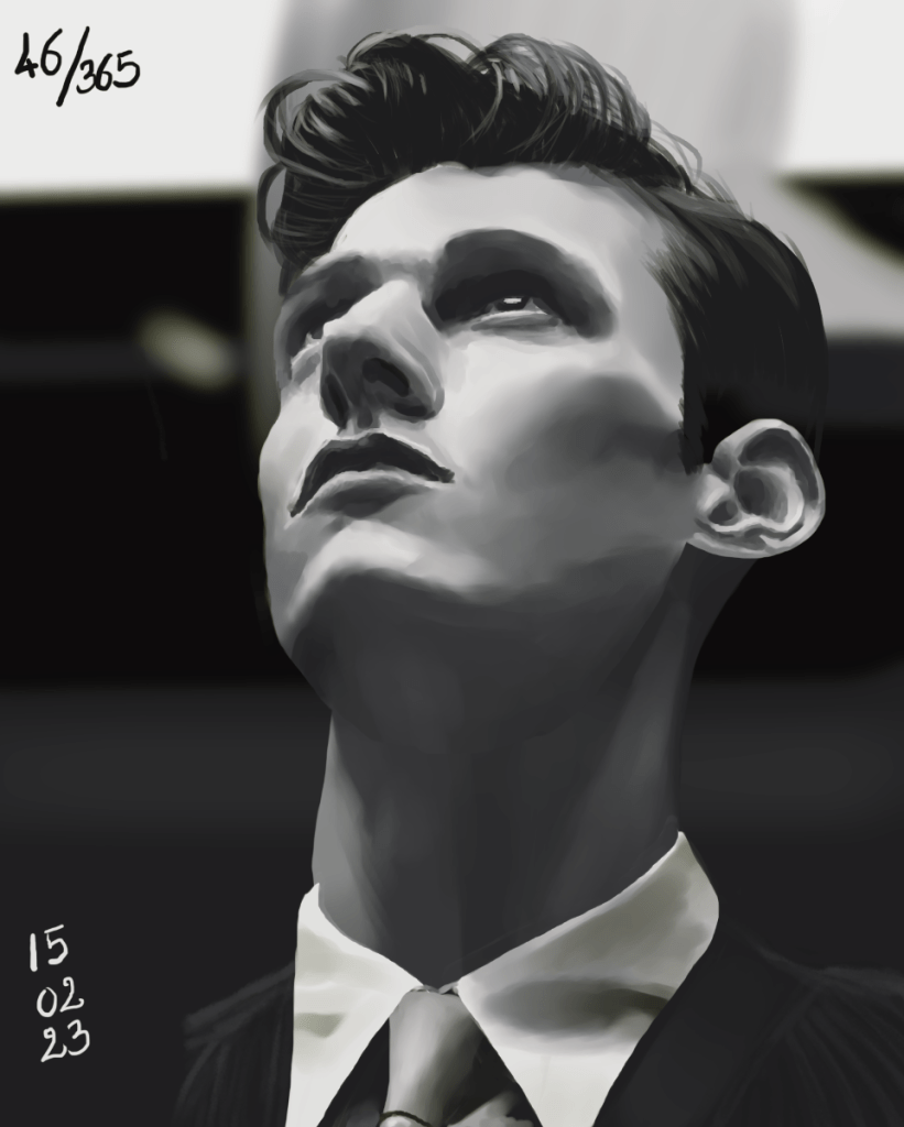 Encore une pose pas si simple, mais un vrai régal. Bon, il manque un petit truc au niveau de l’oeil à gauche, mais pas grave, on fera avec hahaha. Je suis par contre super fière de la cravate. Et d’avoir réussi à le faire ressembler à quelque chose! Et c’est aussi là où je me dis que c’est plus facile de travailler en masse: peu importe la pose, c’est le même principe, et on construit les zones de lumière et d’ombre, du plus gros au détail. Un portrait à la fois, un jour à la fois!