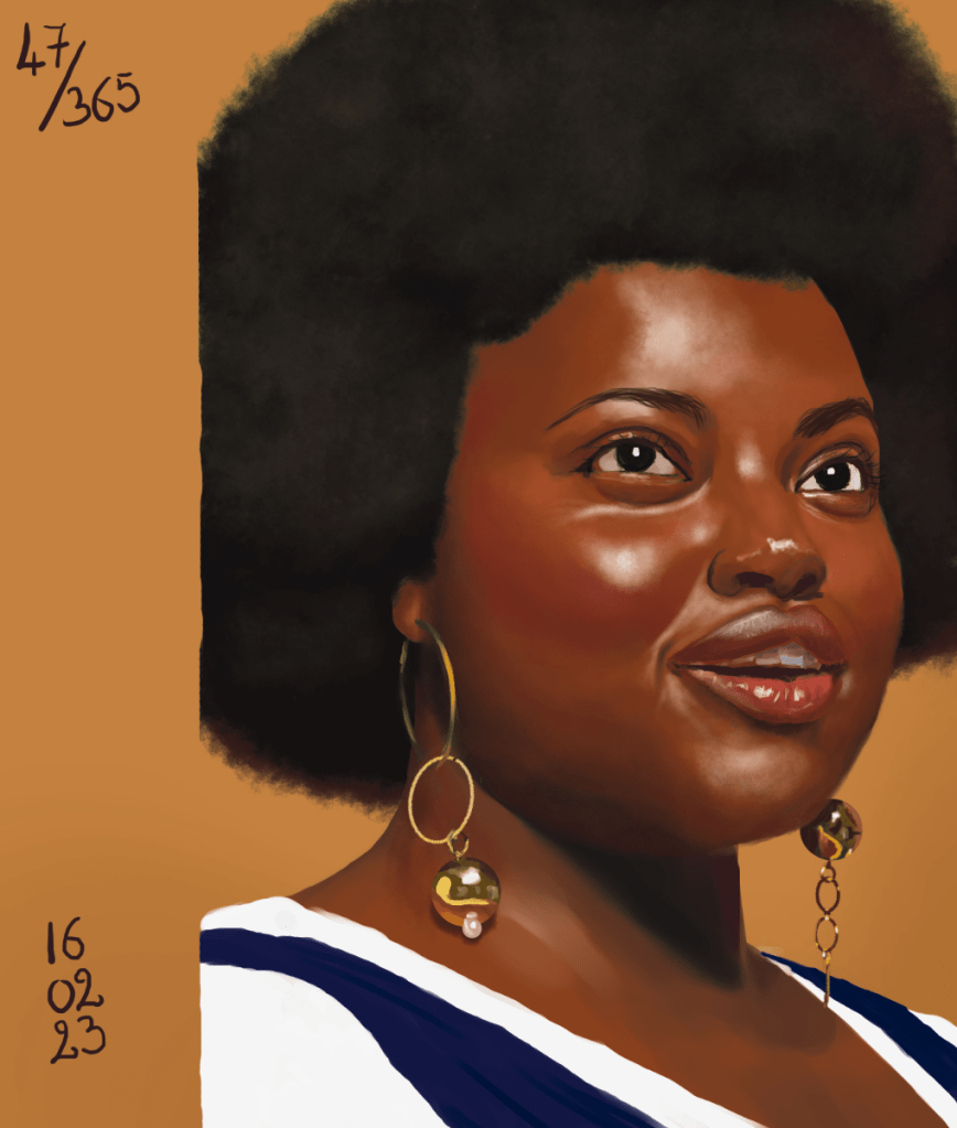 Pour ce portrait, j’ai opté pour une brush texturée, plus compliqué à utiliser que ma brush habituelle, mais elle correspondait vraiment à la texture de la peau de la référence… Et j’avoue, je me suis fait plaisir pour rendre les boucles d’oreille. C’est en fait bien plus simple que je ne le pensais. Et ma brush était aussi parfaite pour ses cheveux, un vrai bonheur!