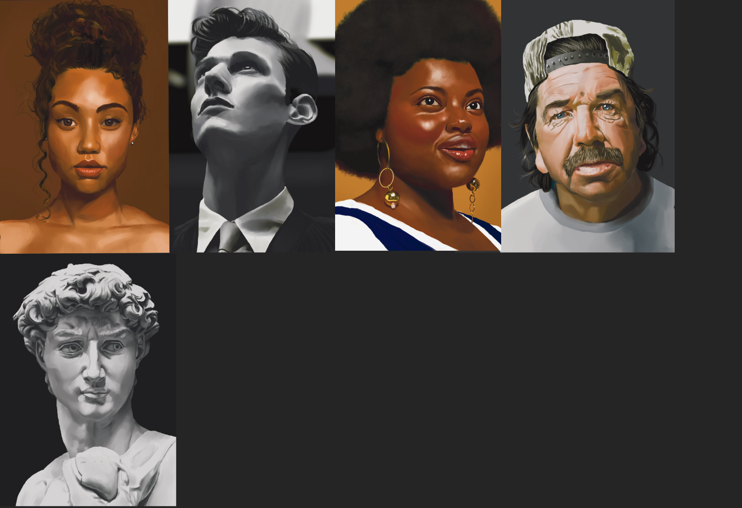 Cette année, je participe au challenge 365 visages. Une étude de portrait par jour, tous les jours de l’année. Il existe des tas de groupes ou de propositions pour réaliser ce challenge. Quant à moi, puisque j’ai repris les cours, j’ai décidé de joindre celui proposé sur Digital Painting School, avec d’autres élèves. Le principe est simple: l’organisatrice du challenge nous donne une photo à étudier. On peut ne faire que le croquis, ou réaliser une étude en la peignant digitalement, ou à l’aquarelle, aux crayons de couleurs, aux feutres… Les possibilités sont infinies. Certains ont opté pour les croquis sur carnet, d’autres le font sur l’ordinateur… Certains s’essaient à la méthode de construction Loomis, d’autres essaient de faire sans, d’autres encore (et c’est mon cas) ont opté pour travailler en masses (pas de croquis, on applique les couleurs pour dessiner les volumes et les ombres, la lumière et on affine au fur et à mesure…). On peut se donner une limite de temps, ou profiter de cette expériences pour explorer les jeux de lumières, les valeurs, les teintes… bref, tout est possible. Les références alternent entre visages masculins et féminins, et sont très très variées: tous les ages, les ethnicités, en couleurs, en noir et blanc, voire même des peintures de maitres… un véritable régal, ce challenge!