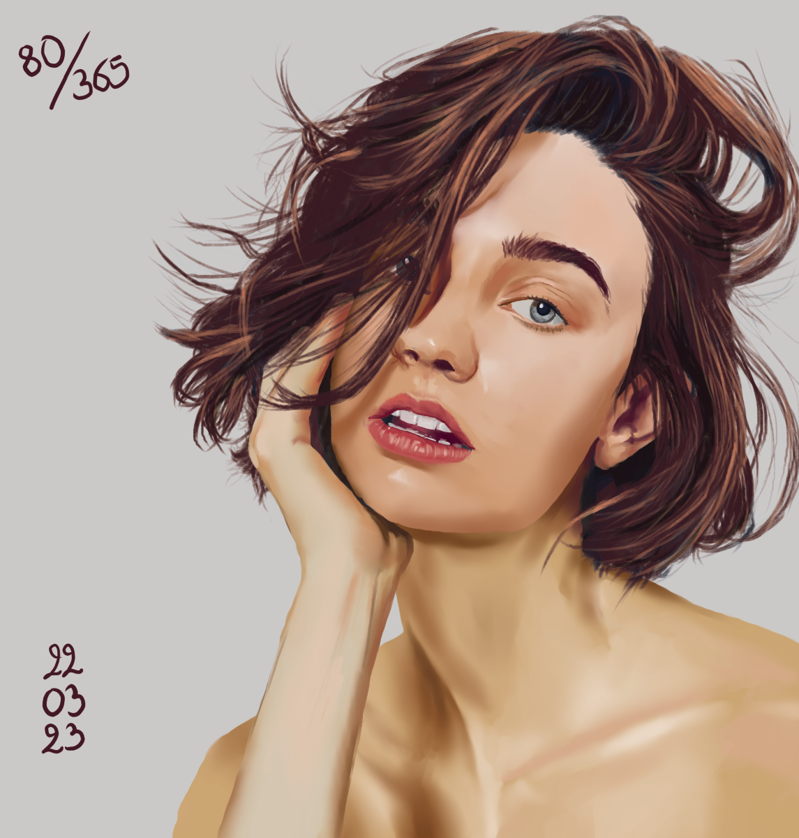 J’ai fait une pause après le précédent et je me suis lancée dans l’étude suivante.. et 2h 38 pour celui-ci, et pourtant, des vêtements, des cheveux, une lumière particulière, une oreille… mais je ne sais pas, je devais avoir la bonne playlist dans les oreilles hahaha. J’ai vraiment beaucoup aimé le peindre, en n’hésitant pas non plus à utiliser des couleurs particulières pour les cheveux, parce que la référence l’exigeait (et donc oui, le vert, c’est normal, cerveau, ça dépend de la lumière… ). C’est drôle, la veille, je n’arrivais à rien, et là, j’avais l’impression d’avoir passé un palier… encore un mystère mystérieux!