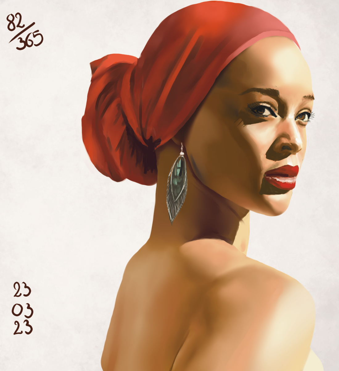 Le foulard avait des motifs dessus et elle portait un collier. Mais c’est là où j’ai décidé d’essayer de ne pas dépasser 2h30… 2h37 pour elle. J’ai quand même eu le temps de faire sa boucle d’oreille et les plis de son foulard… La lumière était particulière pour celui-ci, et c’était super intéressant. ça commence à venir!