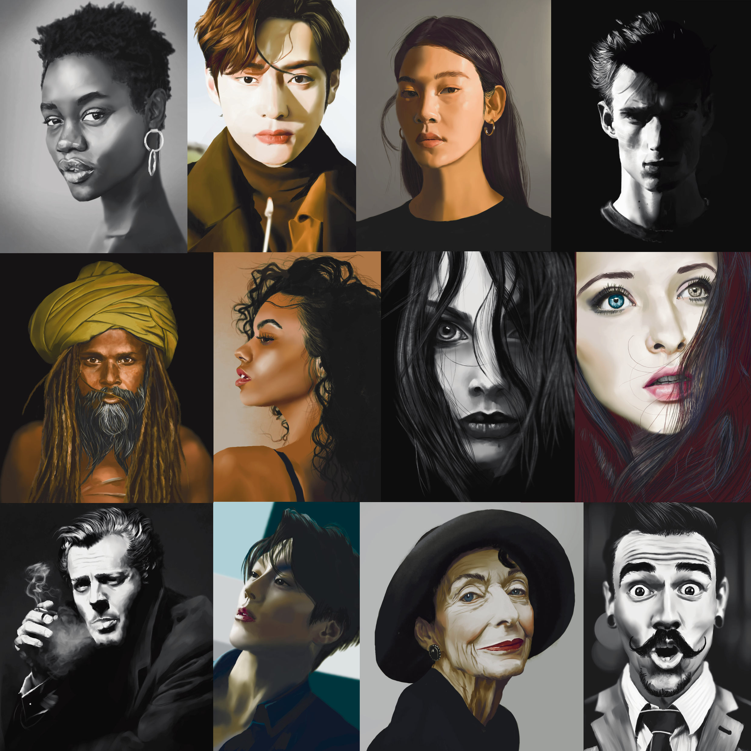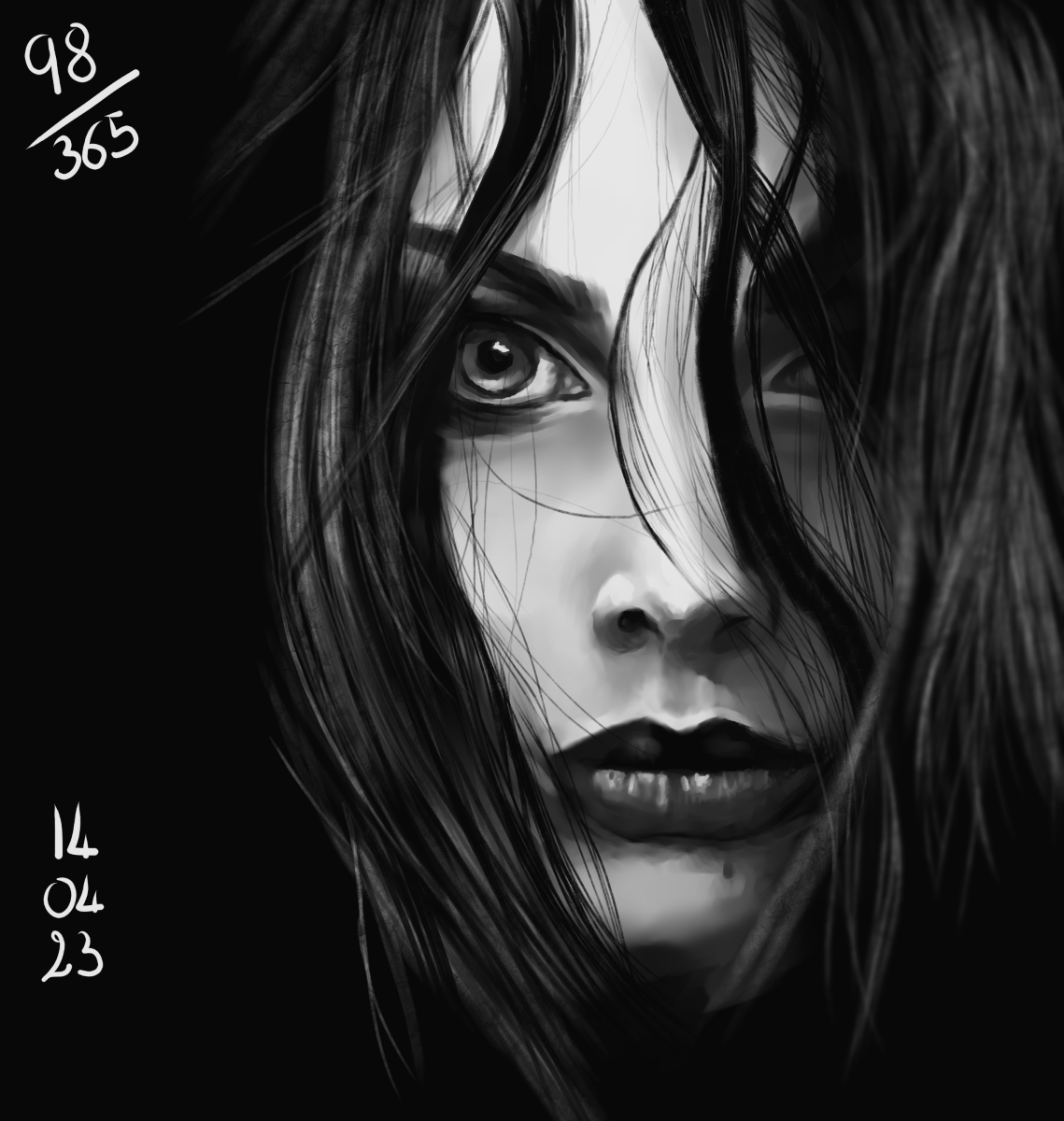 J’avais envie d’une référence intense, et j’ai choisi celle-ci. Au départ, je pensais que c’était des mèches sur son front, mais non, c’étaient des cicatrices… du coup, j’ai pu étudier quelque chose de nouveau. Et puis je prends tellement plaisir à peindre ces portraits en noir et blanc!