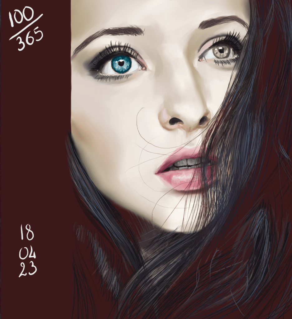 Mon 100 ème portrait!! Pour fêter ça, je voulais choisir une référence spéciale. Et puisque je suis dans mon trip yeux, celle-ci m’a parue parfaite! Et puis l’effet dans la chevelure, quel défi! J’ai pris beaucoup de plaisir à faire cette étude, et je suis plutôt contente du résultat. J’ai vraiment marqué le coup!
