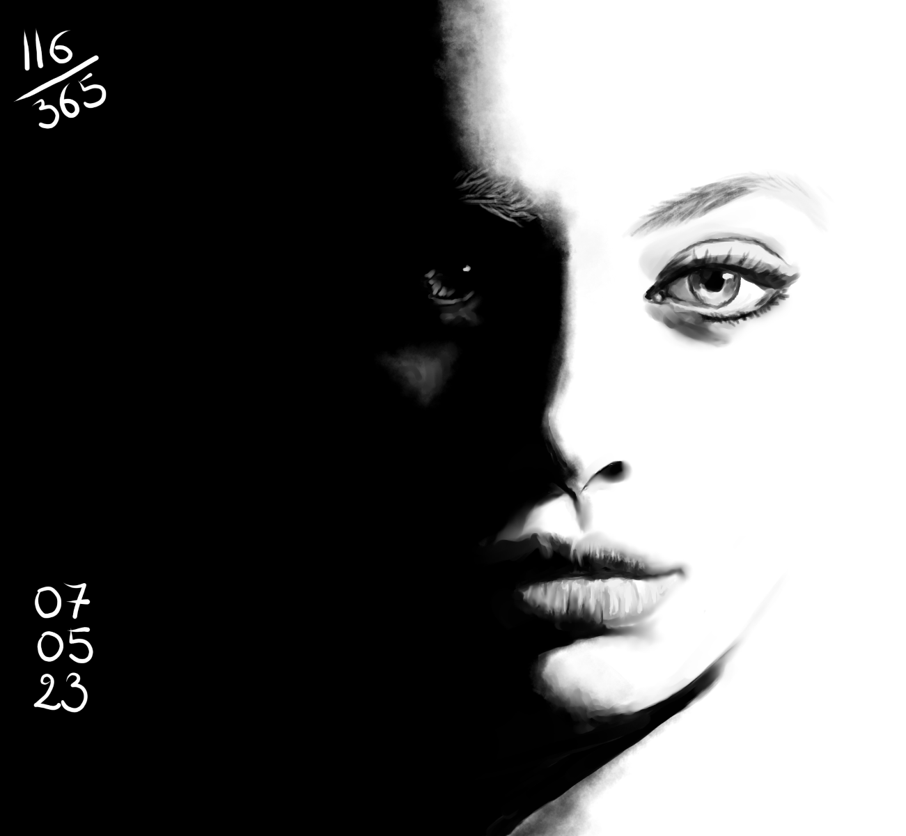 Rappel: Cette année, je participe au challenge 365 visages. Une étude de portrait par jour, tous les jours de l’année. Il existe des tas de groupes ou de propositions pour réaliser ce challenge. Quant à moi, puisque j’ai repris les cours, j’ai décidé de joindre celui proposé sur Digital Painting School, avec d’autres élèves. Le principe est simple: l’organisatrice du challenge nous donne une photo à étudier. On peut ne faire que le croquis, ou réaliser une étude en la peignant digitalement, ou à l’aquarelle, aux crayons de couleurs, aux feutres… Les possibilités sont infinies. Certains ont opté pour les croquis sur carnet, d’autres le font sur l’ordinateur… Certains s’essaient à la méthode de construction Loomis, d’autres essaient de faire sans, d’autres encore (et c’est mon cas) ont opté pour travailler en masses (pas de croquis, on applique les couleurs pour dessiner les volumes et les ombres, la lumière et on affine au fur et à mesure…). On peut se donner une limite de temps, ou profiter de cette expériences pour explorer les jeux de lumières, les valeurs, les teintes… bref, tout est possible. Les références alternent entre visages masculins et féminins, et sont très très variées: tous les ages, les ethnicités, en couleurs, en noir et blanc, voire même des peintures de maitres… un véritable régal, ce challenge!