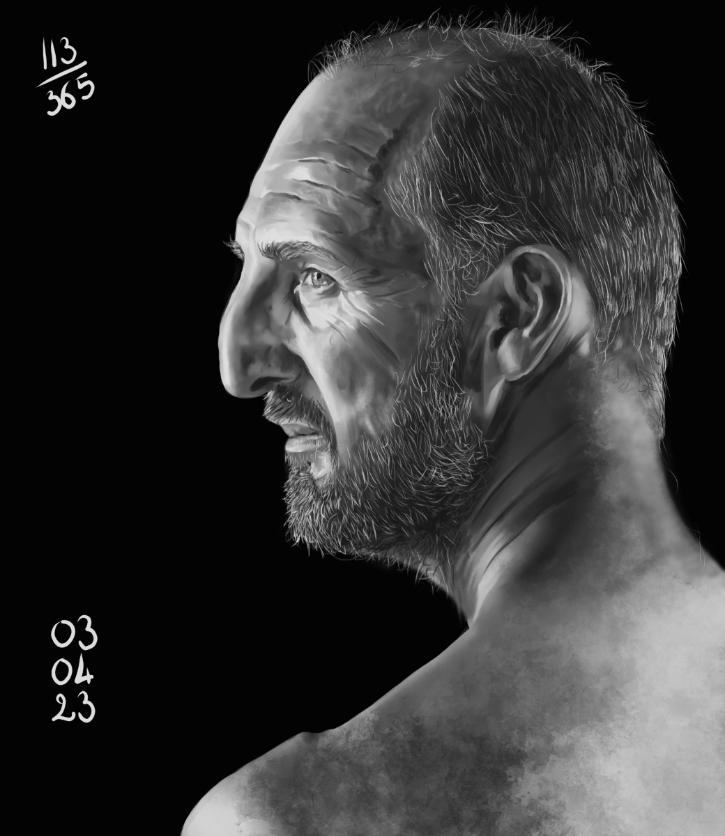 Et la semaine a fini en apothéose, avec cette référence qui m’a fait sortir de ma zone de confort +++. Des rides, une peau claire avec des contrastes de folie, des poils, du tissu… la totale!! J’ai passé 4h sur cette étude donc complètement hors délai… MAIS j’ai plutôt réussi le rendu des rides, même si mon étude est plus claire que la référence, c’est plutôt correct, et il n’a pas l’air vampirique, j’ai repris le même process que l’autre jour pour la barbe, et ça a plutôt bien fonctionné, et j’ai plié la chemise en 2 temps 3 mouvements… Donc globalement, un succès, cette étude!! Mais 4h… sur tablette, ce qui en temps réel fait beaucoup plus, entre les pauses nécessaires, les mises en miroir pour vérifier que je suis sur la bonne voie, et ma sortie de PLS initiale hahaha.