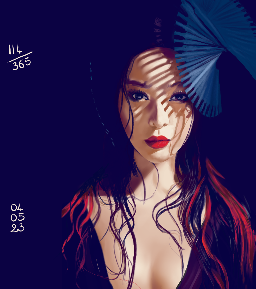 Et là, la claque… l’éventail (sur lequel j’ai passé beaucoup trop de temps pour un résultat pas folichon), les cheveux, les ombres sur le visage… pfiou!!! La référence m’a vraiment plu, et je pense que je la referai dans quelques mois, pour le plaisir. Cette étude a vraiment été une expérience intéressante, et j’ai beaucoup appris. Un petit coup de boost créatif!