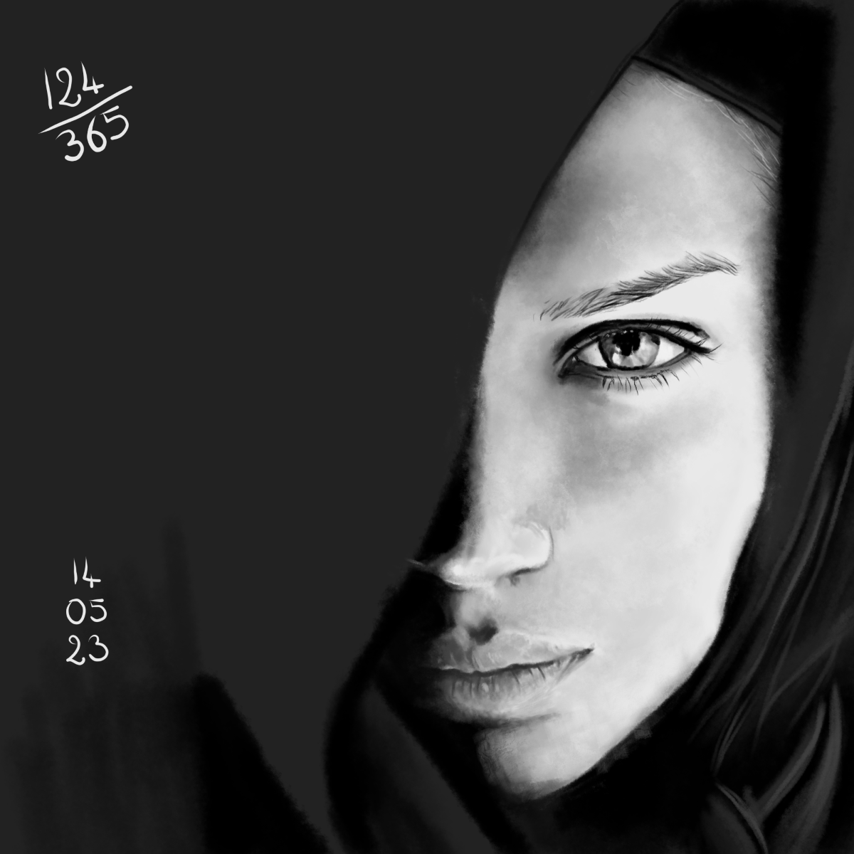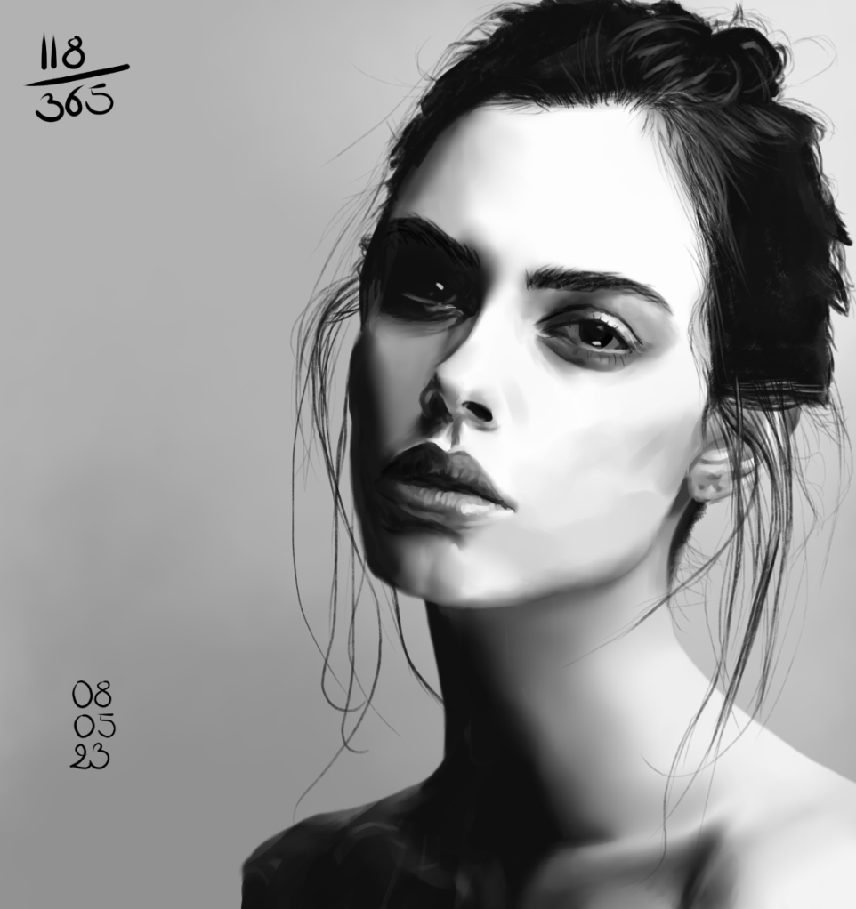 Rappel: Cette année, je participe au challenge 365 visages. Une étude de portrait par jour, tous les jours de l’année. Il existe des tas de groupes ou de propositions pour réaliser ce challenge. Quant à moi, puisque j’ai repris les cours, j’ai décidé de joindre celui proposé sur Digital Painting School, avec d’autres élèves. Le principe est simple: l’organisatrice du challenge nous donne une photo à étudier. On peut ne faire que le croquis, ou réaliser une étude en la peignant digitalement, ou à l’aquarelle, aux crayons de couleurs, aux feutres… Les possibilités sont infinies. Certains ont opté pour les croquis sur carnet, d’autres le font sur l’ordinateur… Certains s’essaient à la méthode de construction Loomis, d’autres essaient de faire sans, d’autres encore (et c’est mon cas) ont opté pour travailler en masses (pas de croquis, on applique les couleurs pour dessiner les volumes et les ombres, la lumière et on affine au fur et à mesure…). On peut se donner une limite de temps, ou profiter de cette expériences pour explorer les jeux de lumières, les valeurs, les teintes… bref, tout est possible. Les références alternent entre visages masculins et féminins, et sont très très variées: tous les ages, les ethnicités, en couleurs, en noir et blanc, voire même des peintures de maitres… un véritable régal, ce challenge!