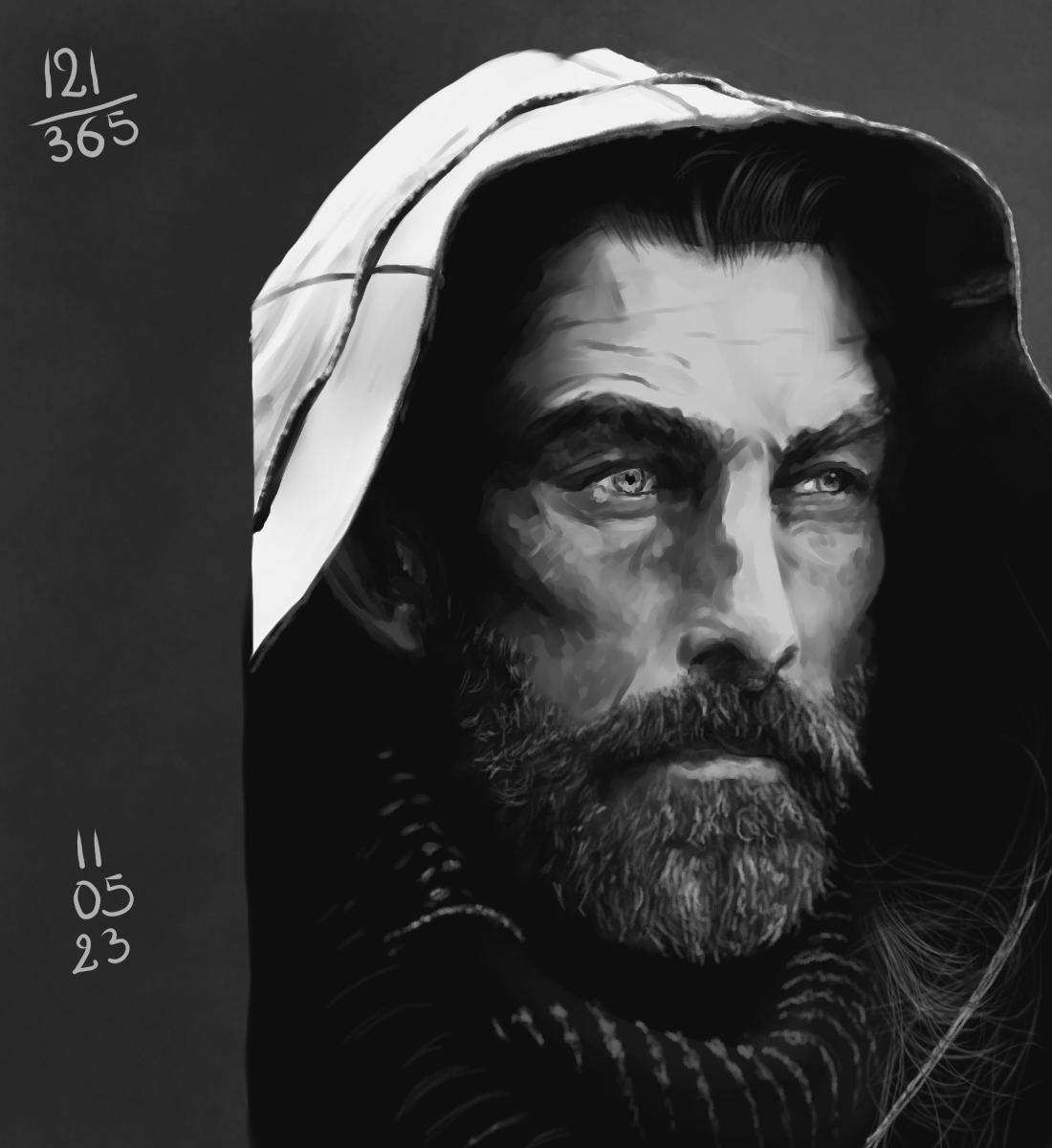 Pour cette étude, j’ai choisi de me concentrer sur la texture de son visage. Et j’avoue ne pas avoir apporté autant de soin à son couvre chef. Parce que je pense que j’aurai pu y passer encore quelques heures hahaha. Encore une belle référence et une opportunité d’aller un peu plus loin dans mon exploration des textures et des brushs que j’ai à ma disposition. pour la barbe, j’ai appliqué le même process que la semaine dernière, et j’avoue, je suis super contente du rendu, même s’il peut encore être amélioré… avec de la pratique. Et j’aurai sans doute d’autres occasions de le faire!