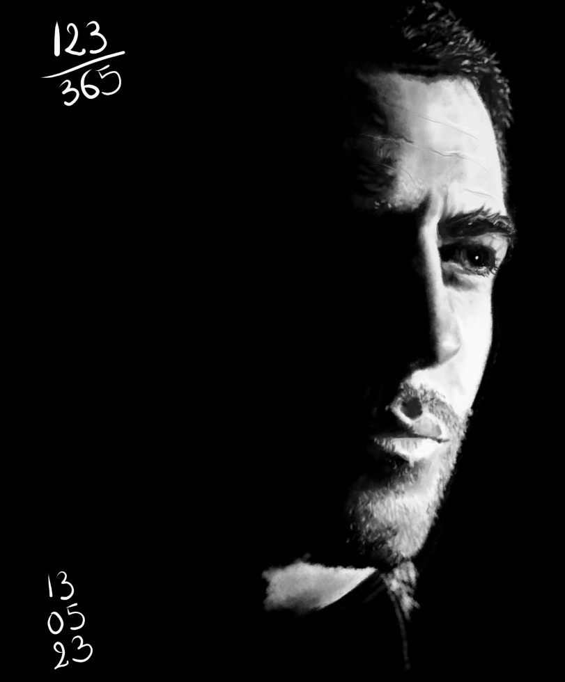 J’ai opté pour la poursuite de mon fil rouge ce week end. C’est donc étude de portraits en noir et blanc avec un gros contraste. Cette fois, le challenge était de rendre sa barbe naissante, mais j’ai arrêté de me dire que c’est difficile, et j’ai procédé pas par pas, après avoir observé la référence pendant un bon moment. Et ça a fonctionné! Quant à l’oeil, je me sens de plus en plus à l’aise, et du coup, ça a été rapide. Je suis super contente de ce que j’ai réussi à faire en un peu plus d’une heure, avec cette référence. Défi relevé!