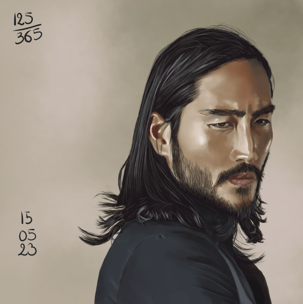 Et on a commencé avec cette référence là… les cheveux plaqués, c’est la vie, clairement! Référence super intéressante au niveau des ombres, ça change un peu, et cet effet sur son torse! J’ai retrouvé mon enthousiasme et ma motivation. Ne jamais rester sur un échec! Du coup, j’ai travaillé sur un seul calque, juste pour le plaisir de me prouver à moi-même que j’en étais capable!