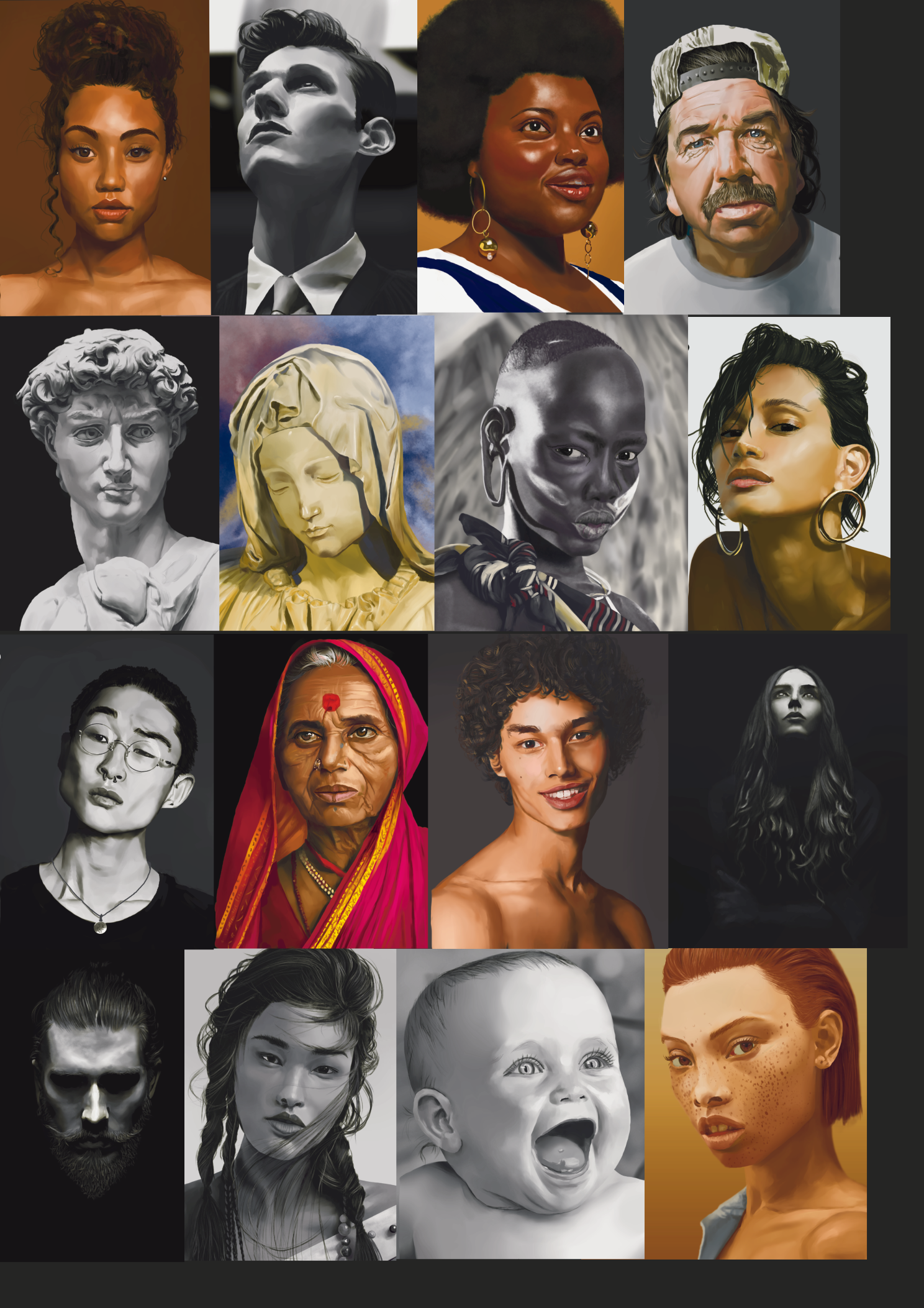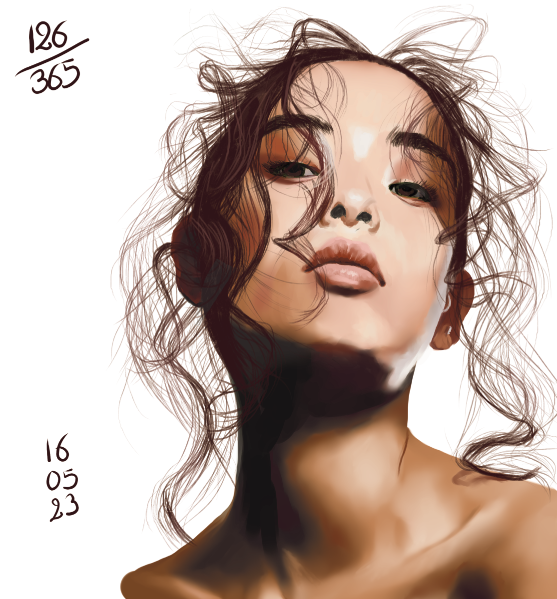 Rappel: Cette année, je participe au challenge 365 visages. Une étude de portrait par jour, tous les jours de l’année. Il existe des tas de groupes ou de propositions pour réaliser ce challenge. Quant à moi, puisque j’ai repris les cours, j’ai décidé de joindre celui proposé sur Digital Painting School, avec d’autres élèves. Le principe est simple: l’organisatrice du challenge nous donne une photo à étudier. On peut ne faire que le croquis, ou réaliser une étude en la peignant digitalement, ou à l’aquarelle, aux crayons de couleurs, aux feutres… Les possibilités sont infinies. Certains ont opté pour les croquis sur carnet, d’autres le font sur l’ordinateur… Certains s’essaient à la méthode de construction Loomis, d’autres essaient de faire sans, d’autres encore (et c’est mon cas) ont opté pour travailler en masses (pas de croquis, on applique les couleurs pour dessiner les volumes et les ombres, la lumière et on affine au fur et à mesure…). On peut se donner une limite de temps, ou profiter de cette expériences pour explorer les jeux de lumières, les valeurs, les teintes… bref, tout est possible. Les références alternent entre visages masculins et féminins, et sont très très variées: tous les ages, les ethnicités, en couleurs, en noir et blanc, voire même des peintures de maitres… un véritable régal, ce challenge!