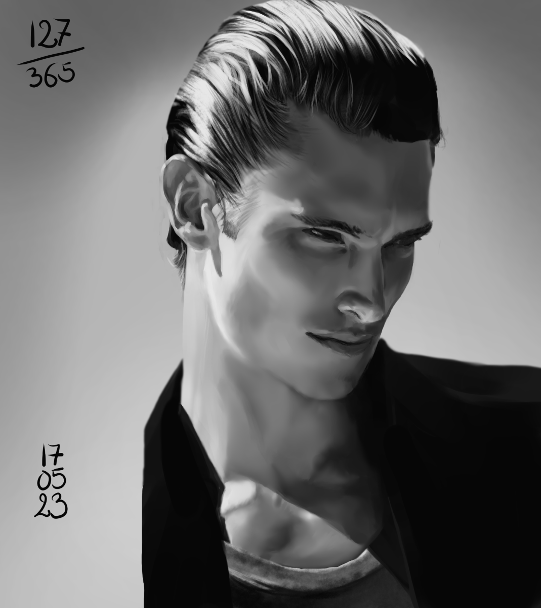 Et on a commencé avec cette référence là… les cheveux plaqués, c’est la vie, clairement! Référence super intéressante au niveau des ombres, ça change un peu, et cet effet sur son torse! J’ai retrouvé mon enthousiasme et ma motivation. Ne jamais rester sur un échec! Du coup, j’ai travaillé sur un seul calque, juste pour le plaisir de me prouver à moi-même que j’en étais capable!