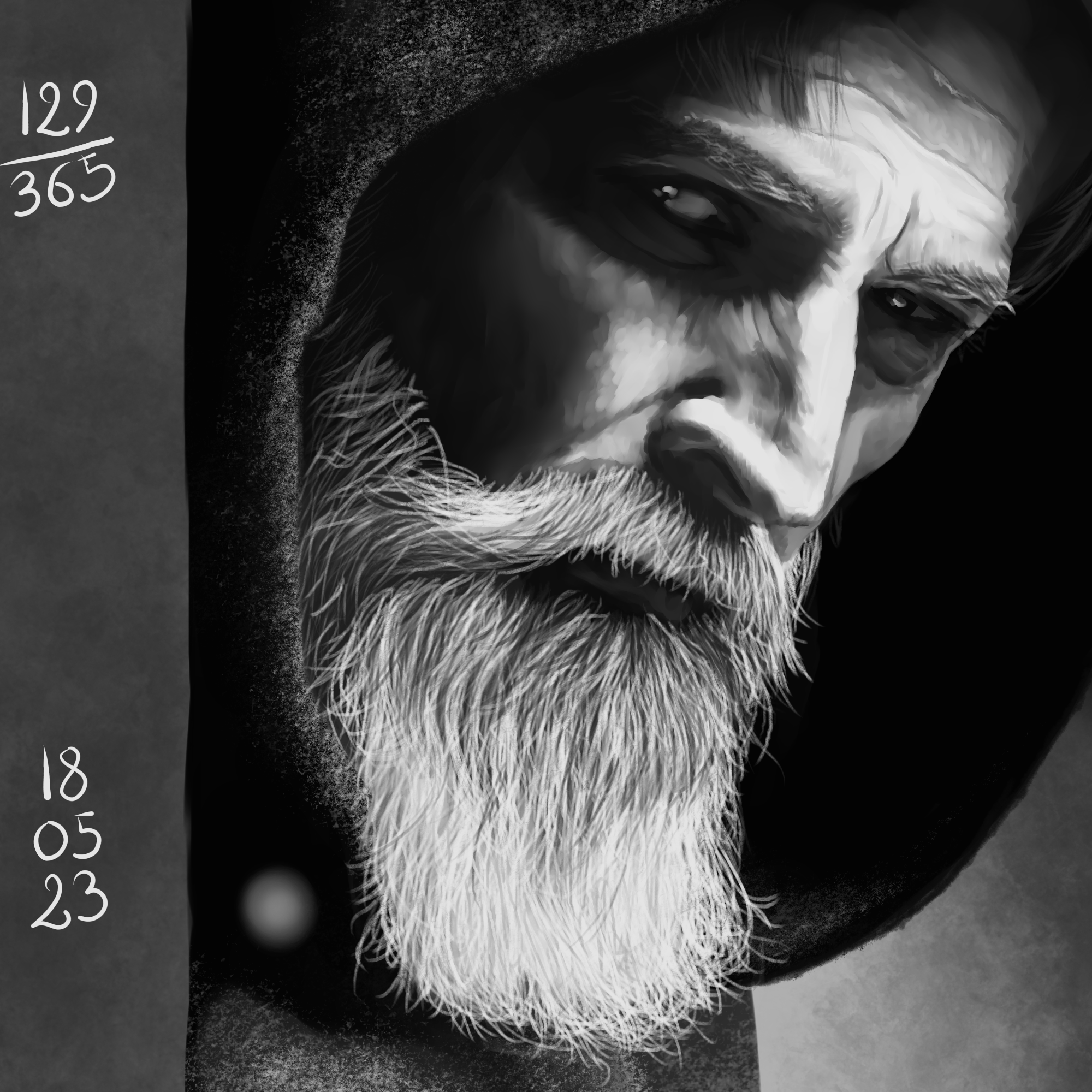 Des poils, des rides, des ombres de fou, de la texture… Mais j’avais cette référence dans mon dossier depuis le début ou presque, et elle me faisait de l’oeil… je me suis donc lancée cette fois, et je ne regrette pas du tout! j’ai même trouvé la brush parfaire pour la texture de son vêtement! Du pur bonheur, ce portrait, et je pense avoir en plus réussi à rendre l’intensité qu’elle m’inspirait.