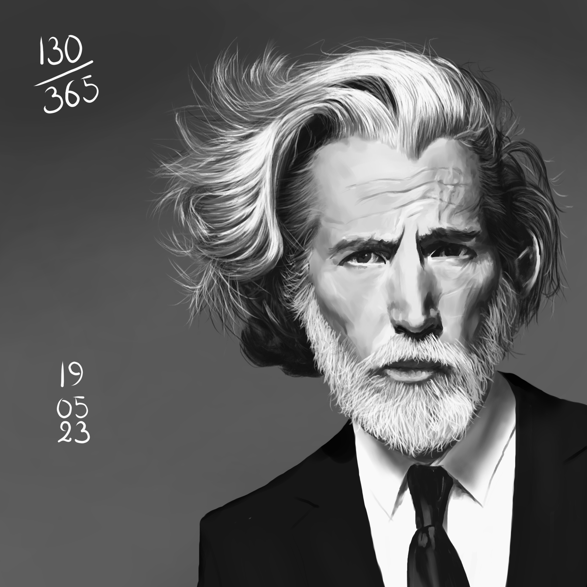 Et la dernière référence de la semaine était clairement un challenge. Des poils, des poils, des poils, des poils… aaaaah. Et puis des rides, et une cravate… bref, j’ai passé beaucoup beaucoup de temps sur elle, mais le résultat en valait la peine. Je suis contente de ce que j’ai réussi à faire, et je n’ai plus peur des poils, et toc!