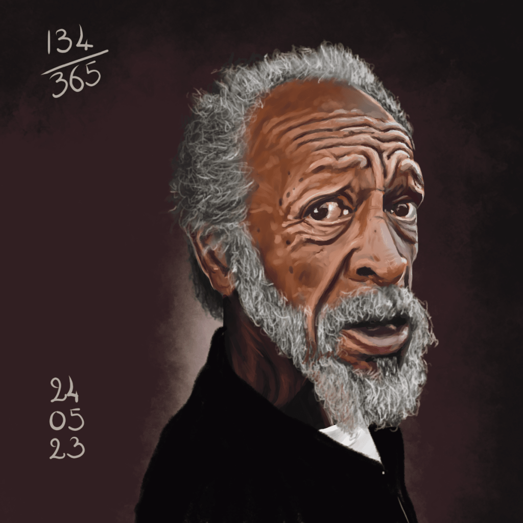 La référence de vendredi ne m’inspirait pas non plus (pas grave en soit, j’ai de quoi faire quand même). Du coup, hop hop hop, un petit tour dans mon dossier à nouveau, et j’ai choisi cette référence. Pas simple du tout, même si en noir et blanc. Mais un visage marqué, un oeil très expressif, du flou. Et ses cheveux! Bref, j’ai pris mon temps, et je me suis fait plaisir. C’est ce qui compte après tout. j’ai aussi tenté de rendre un peu de la texture de sa peau, sans pour autant aller trop dans les détails, ce qui m’aurait pris beaucoup beaucoup plus de temps. Et un de plus!